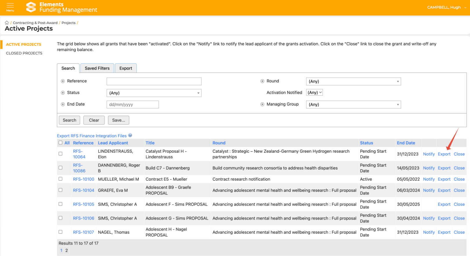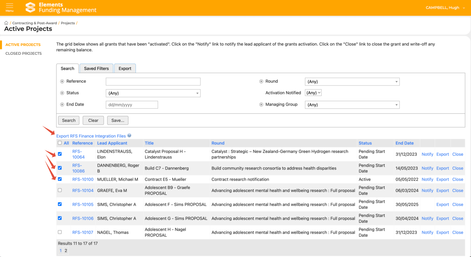 To run an export that will download the results to the saved location (as per the Data Directories settings referred to above), go to Main menu > Contracting & Post-award > Projects > Active Projects. Select the Projects you wish to export using the selection boxes on the left-hand side, then select 'Export RFS Finance Integration Files'.