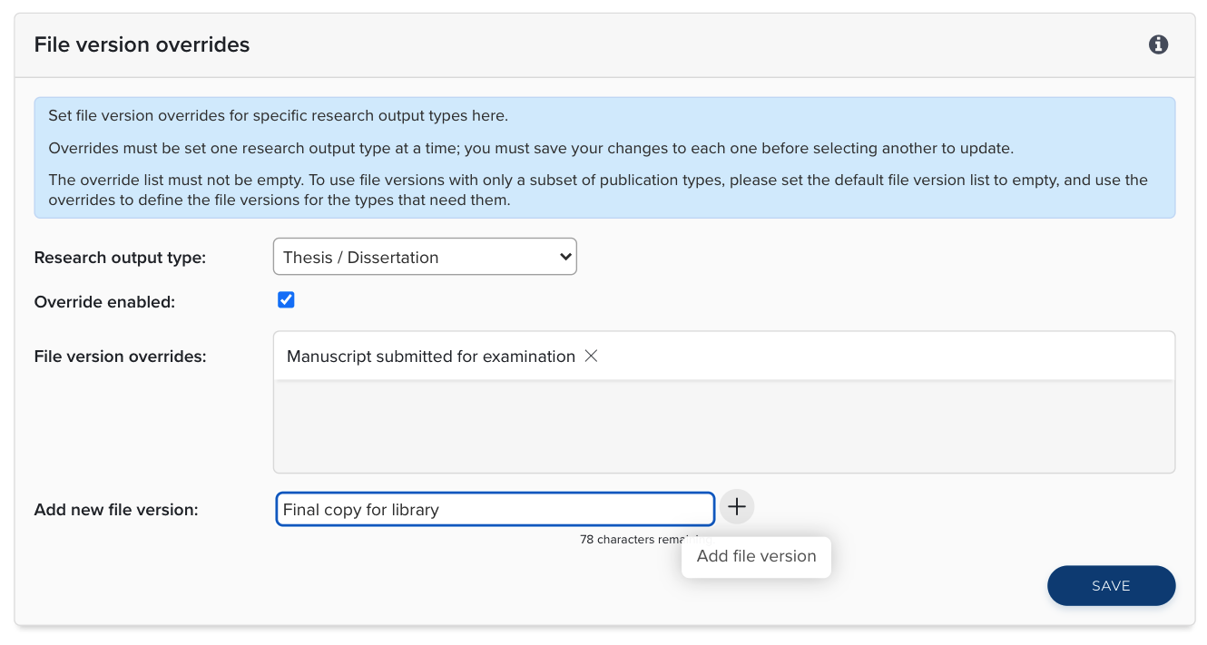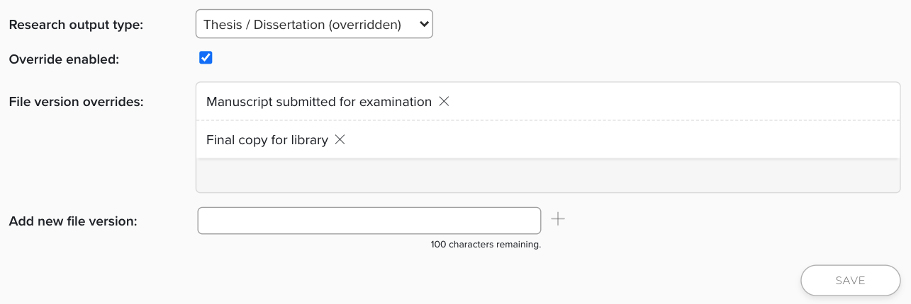 In this section the administrator can set the version names displayed for specific publication types. Select from the dropdown list the publication type you wish to add overrides to. Note that the overrides must be set one type at a time, and the changes must be saved before selecting another type to update. Click on the Override enabled checkbox and a new list appears below. Configure the file versions in the same way you add or delete the default version names.