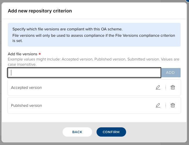This functionality complements OA scheme configuration options which allow administrators to determine which, if any, file version names should be used as a part of an OA scheme's compliance calculations. Navigate to the OA scheme's configuration settings. File version is available as a compliance criterion in Repository criteria > Additional criteria.