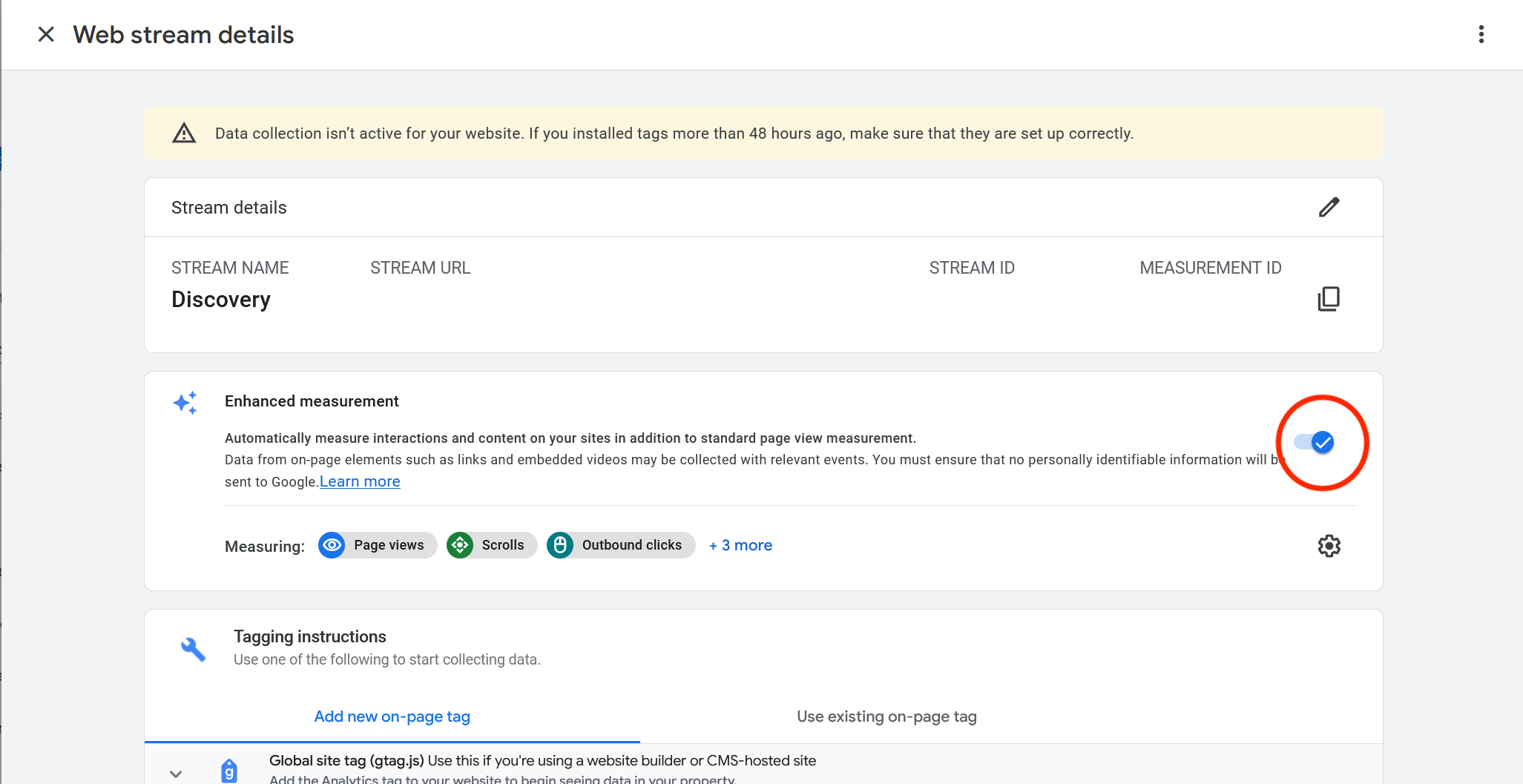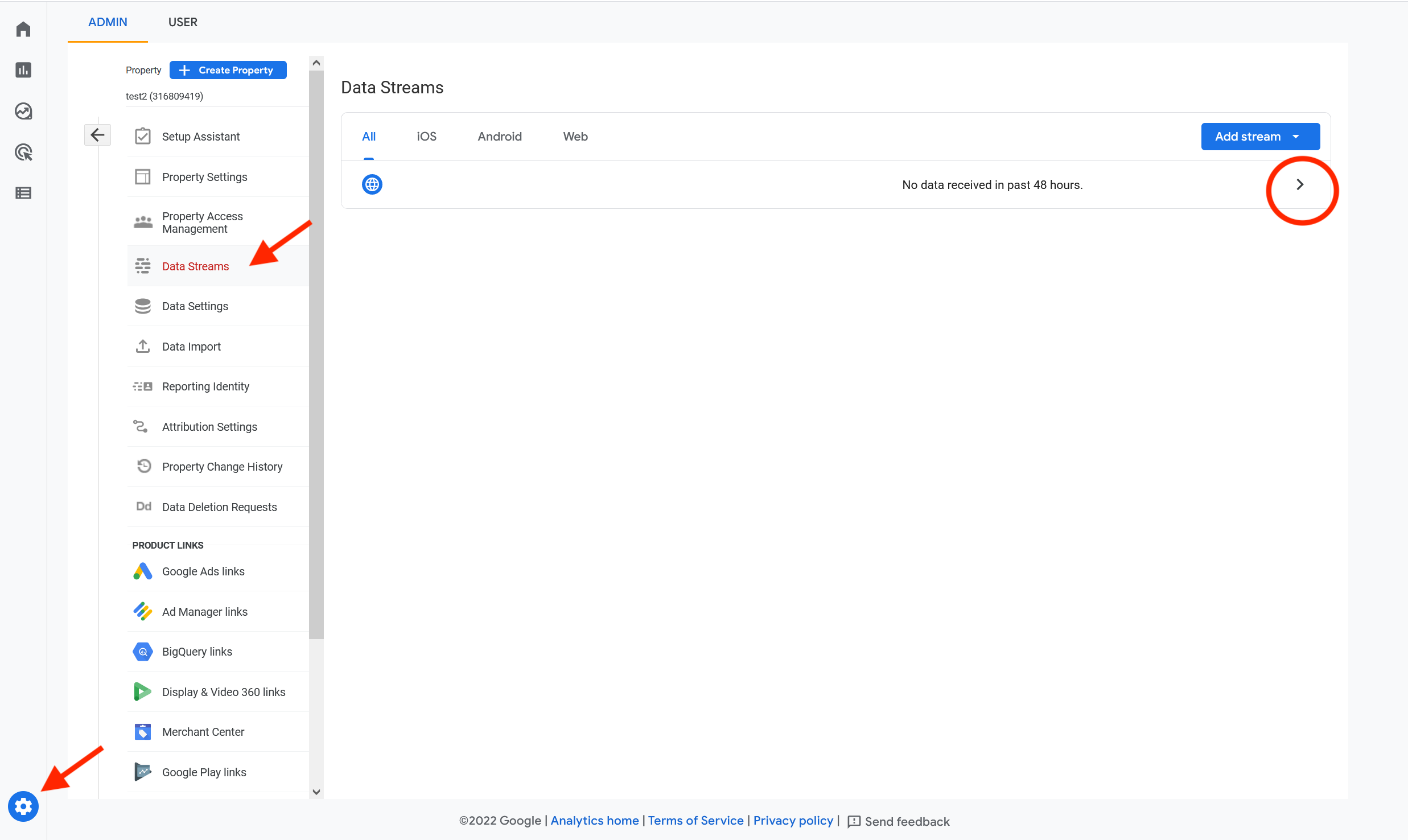 In the admin interface for the Google Analytics account, click on the cog in the lower left corner and find theData Streams page. Once a stream is added, select more details by clicking the right-pointing arrow: