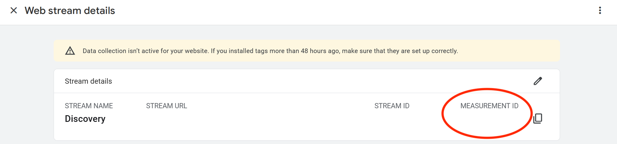 You should be able to find the Measurement ID on the details page. This ID looks like 'G-XXXXXXXXXX' (as opposed to the older Universal Analytics ID, which was of the form 'UA-XXXXXXXXX-1' ). Please raise a support ticket and share this with us.