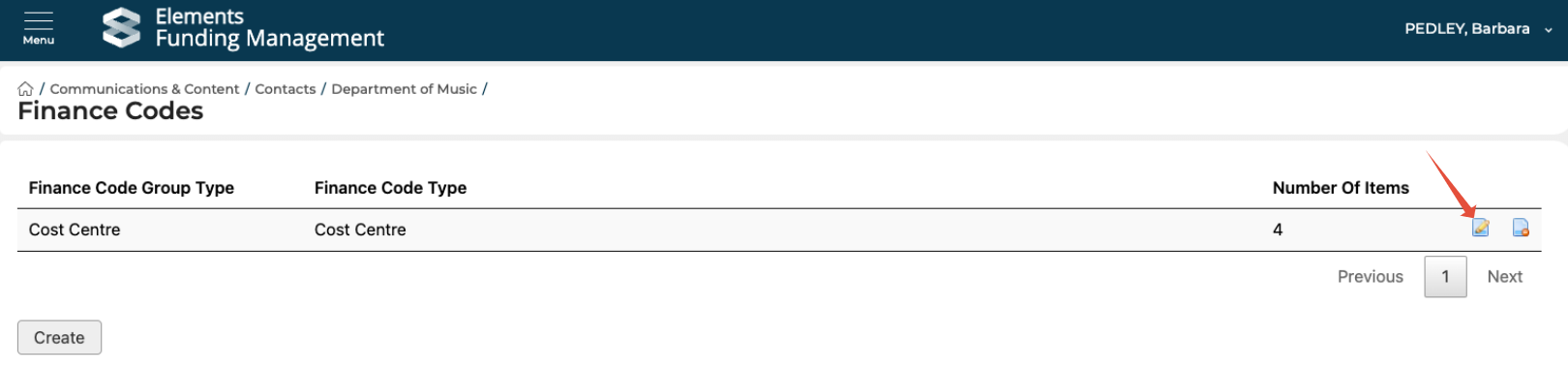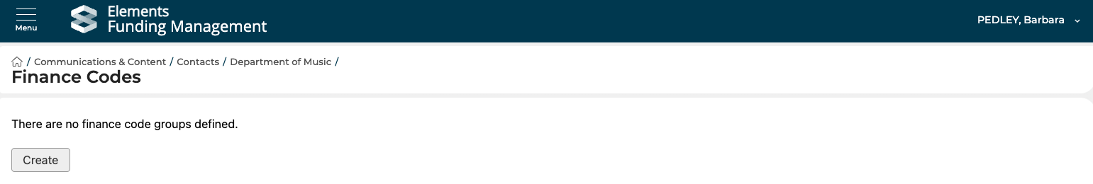 If there are no existing mappings, you first need to create the mapping grouping. Select Create, then select Finance Code Group Type = Cost Centre. All Cost Centres will then be available for selection.
