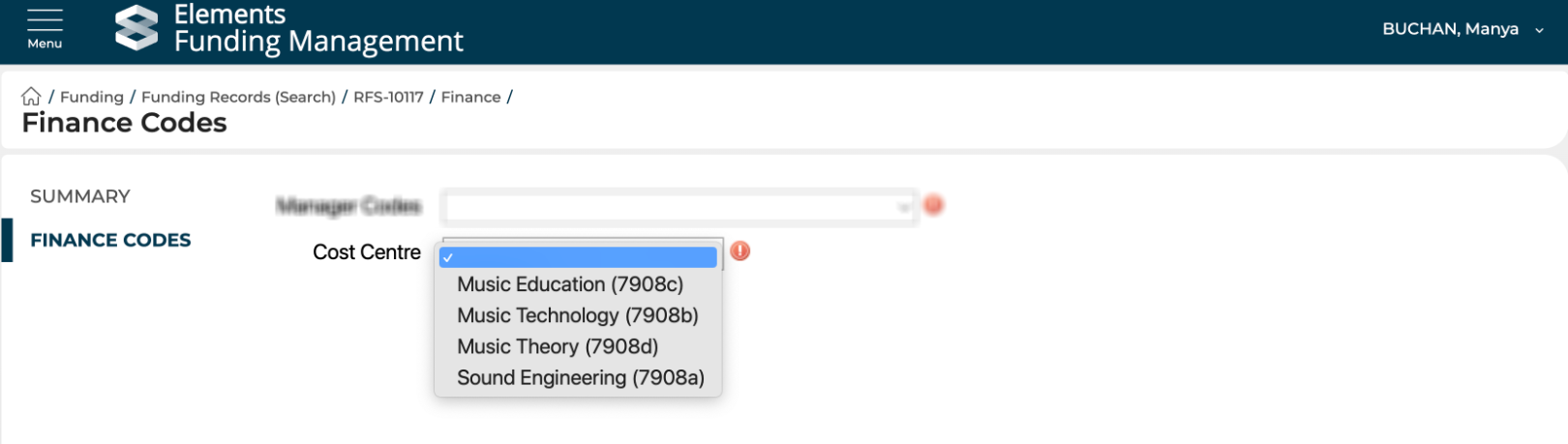 Finance Code Type | Select 'Cost Centre' |
