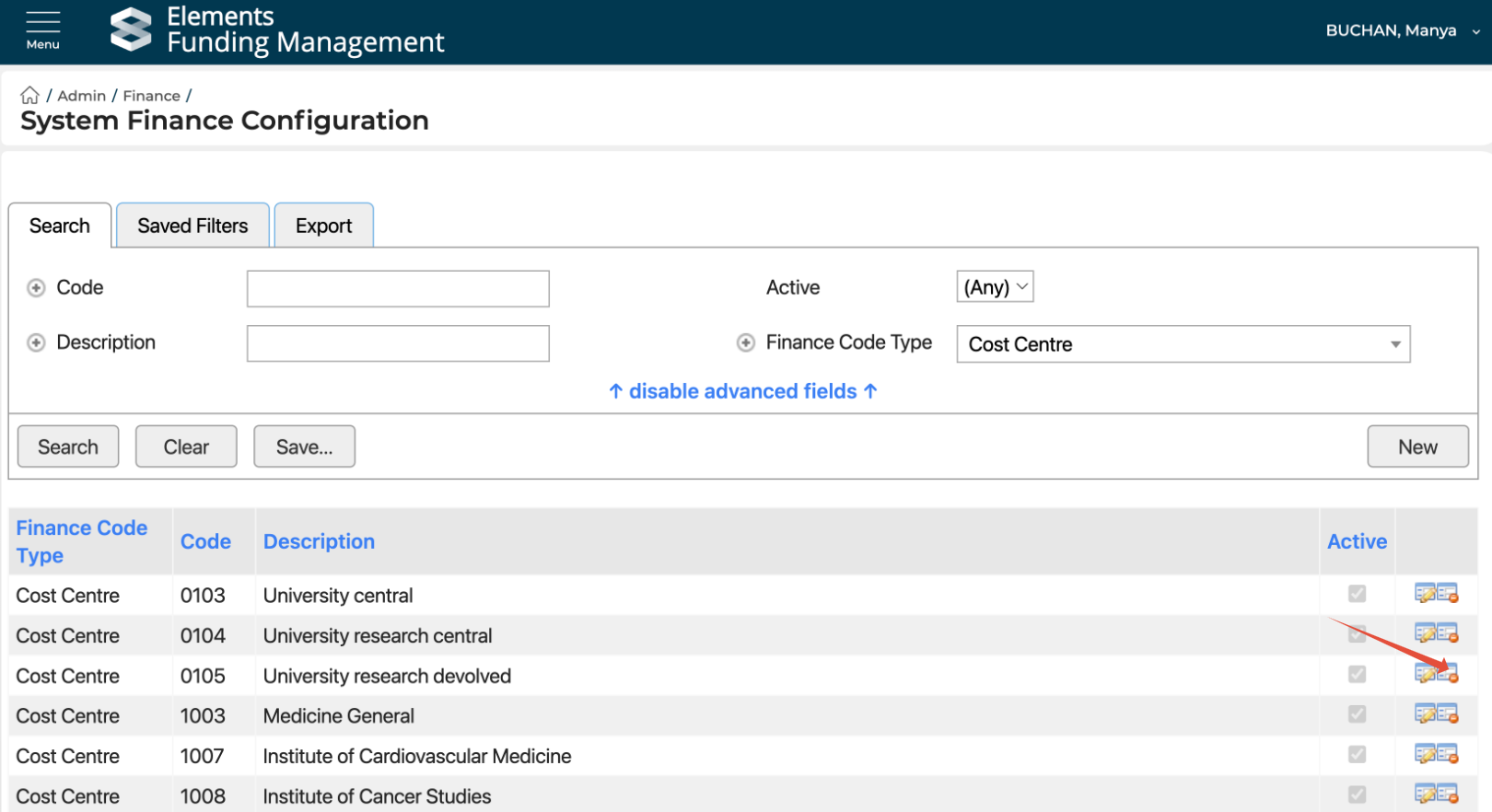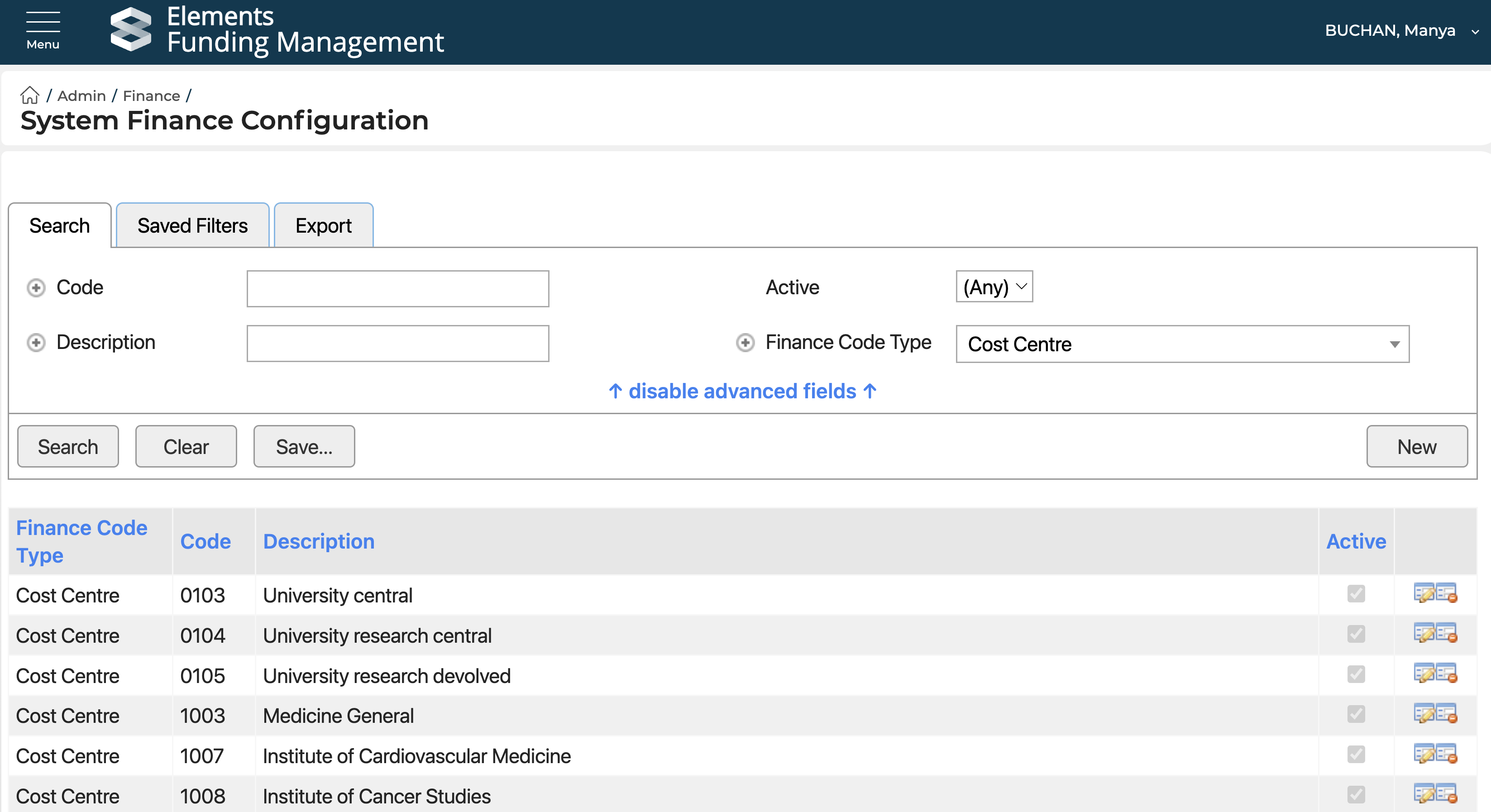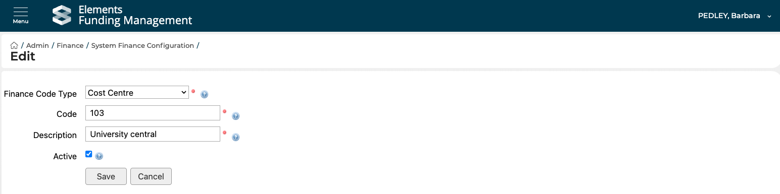 Cost Centres are managed in the Admin > Finance > System Finance Configuration pages, accessible to System Administrators and Research Funding Administrators. Note that this screen is only visible following the initial population of Cost Centres as described above.