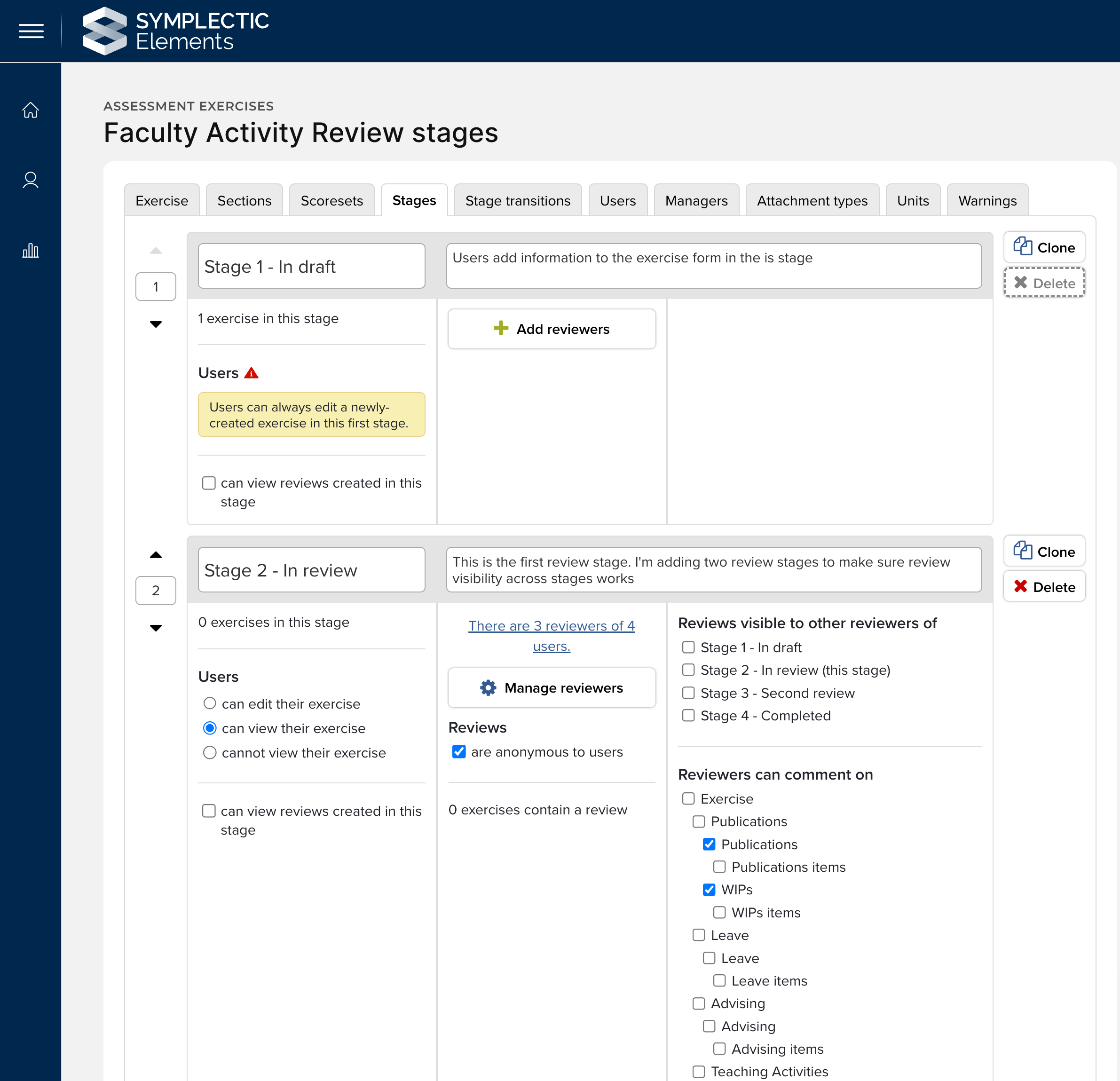 Stages - The ability to define how many stages an exercise includes, as well as whether users can view, edit, or mark an exercise as 'done’, at a particular stage. Additionally, Reviewers are assigned here, as well as what stages reviewers can view and what part of the Assessment Exercise Reviews can comment on and add scores to.