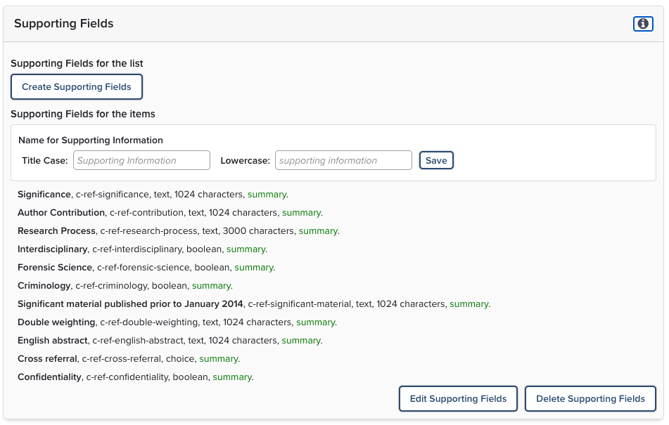 Summary (For ‘custom field list’ items only) - You can choose if the information in the supporting fields should be used on the item summary.