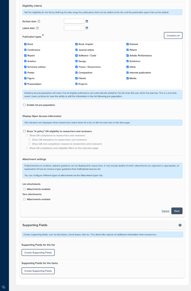 Depending on the type of list configured, items can be selected from Elements objects - Publications, Grants, Professional Activities, Teaching Activities and Impact. Items in custom field lists consist of a set of fields configured by the administrator - giving administrators complete control over the information returned by the user. Items can also be configured to include ‘attachments’, supporting fields’ and ‘reviews’.