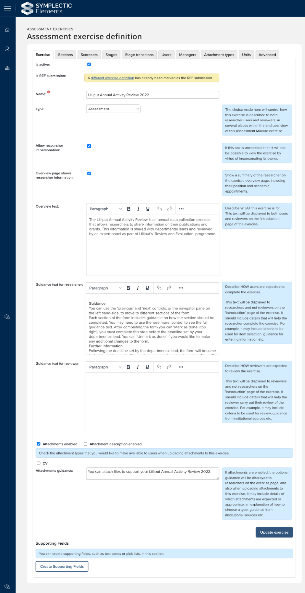 Managers can also be assigned at the unit level, granting those managers permissions only over the users allocated to their unit(s) rather than over the exercise definition as a whole. When setting up an exercise definition which will be subdivided into units it is recommended that the standard exercise definition includes each supporting field that anyone in any of the units will be asked to complete. This forms the default configuration which can then be overridden for each unit. For each of the different units in an exercise definition administrators can selectively hide supporting fields on each unit, modify the in-place guidance about each supporting field, and change the settings for attachments. Administrators can also override the guidance for researchers and reviewers to allow them to ensure each unit has clear instructions about the exercise they are being asked to complete.