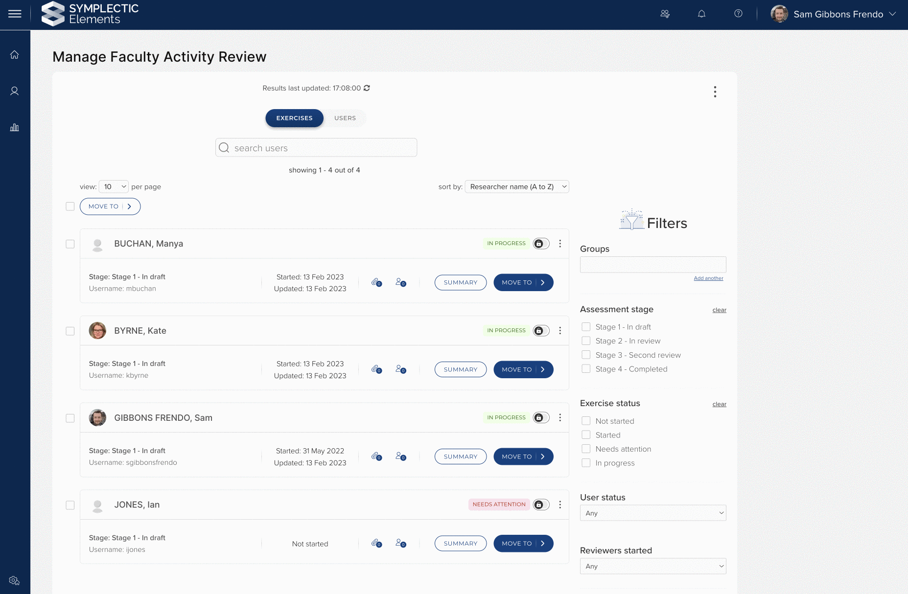 The layout of the filters has been standardised, with a user search at the top of the page so that managers can quickly find the user or Exercise they are looking for. The page also features sort options for both Users and Exercises, offering a rich, browsing experience.