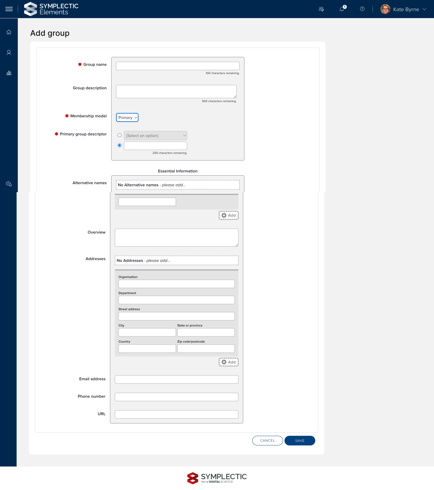 A new Add Group page allows administrators configuring new groups to add both core operational metadata (title, description and membership model) and descriptive metadata to provide a streamlined creation experience.