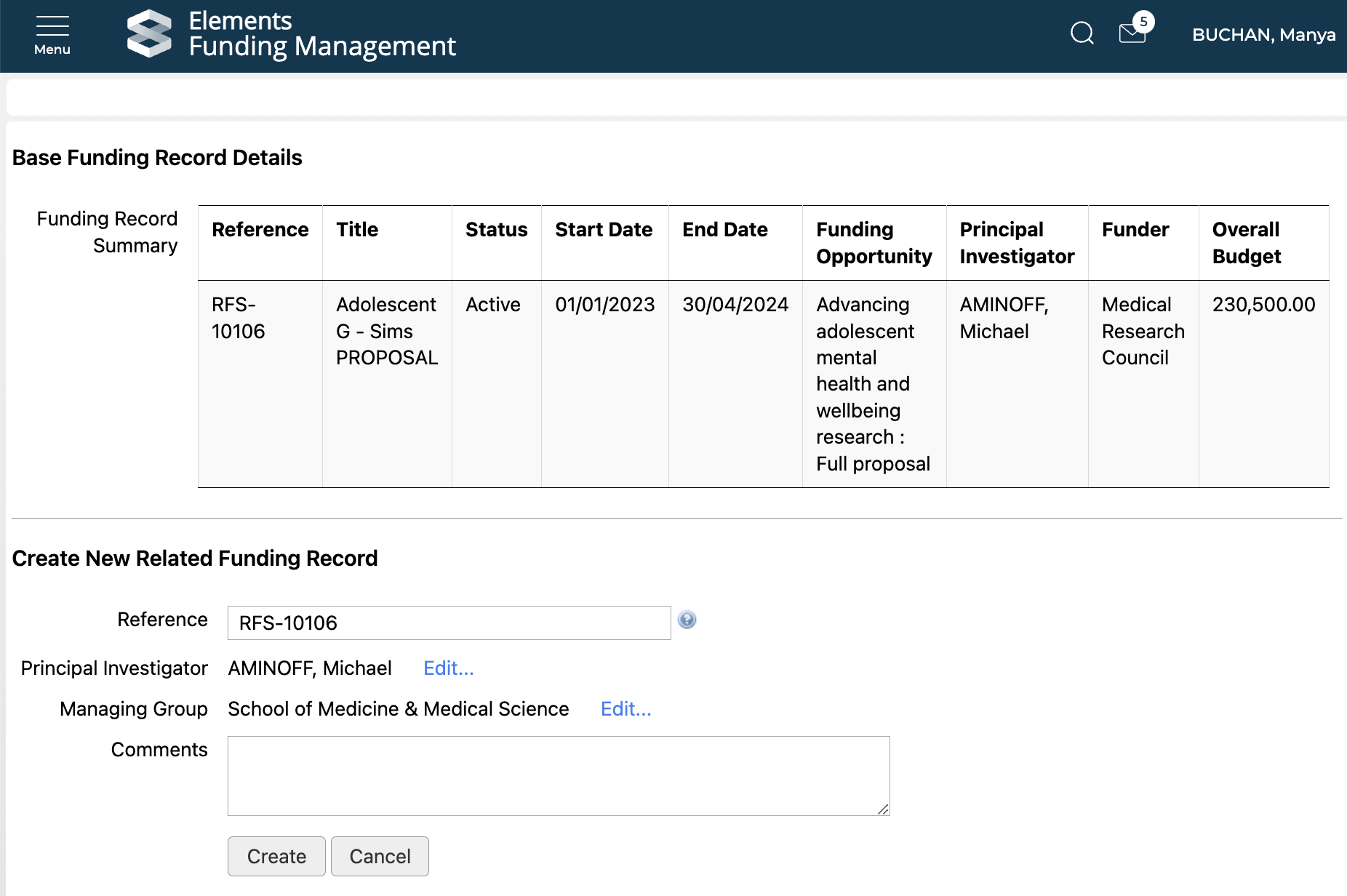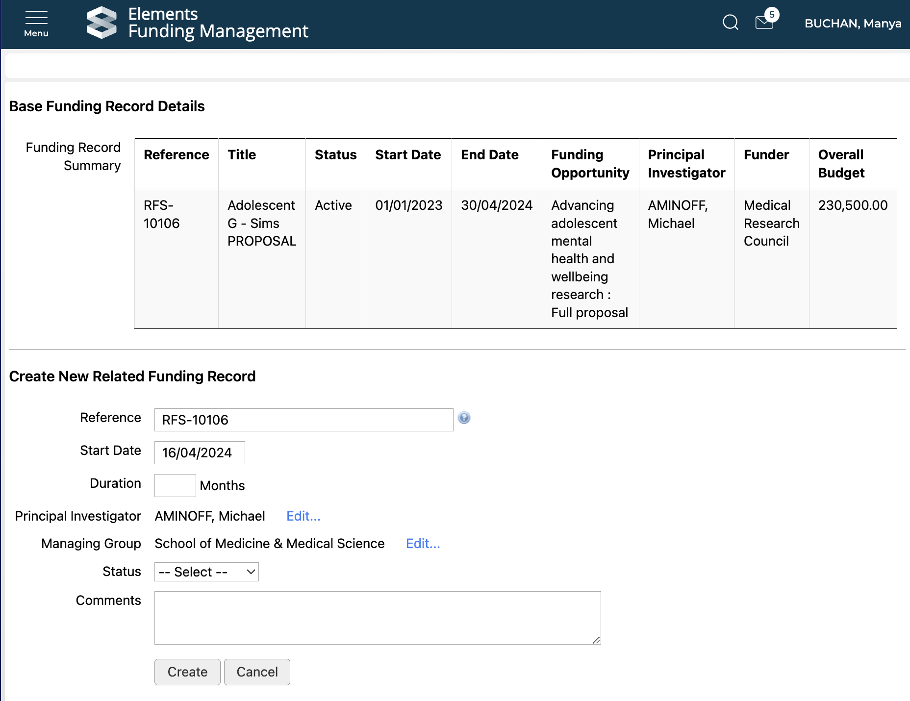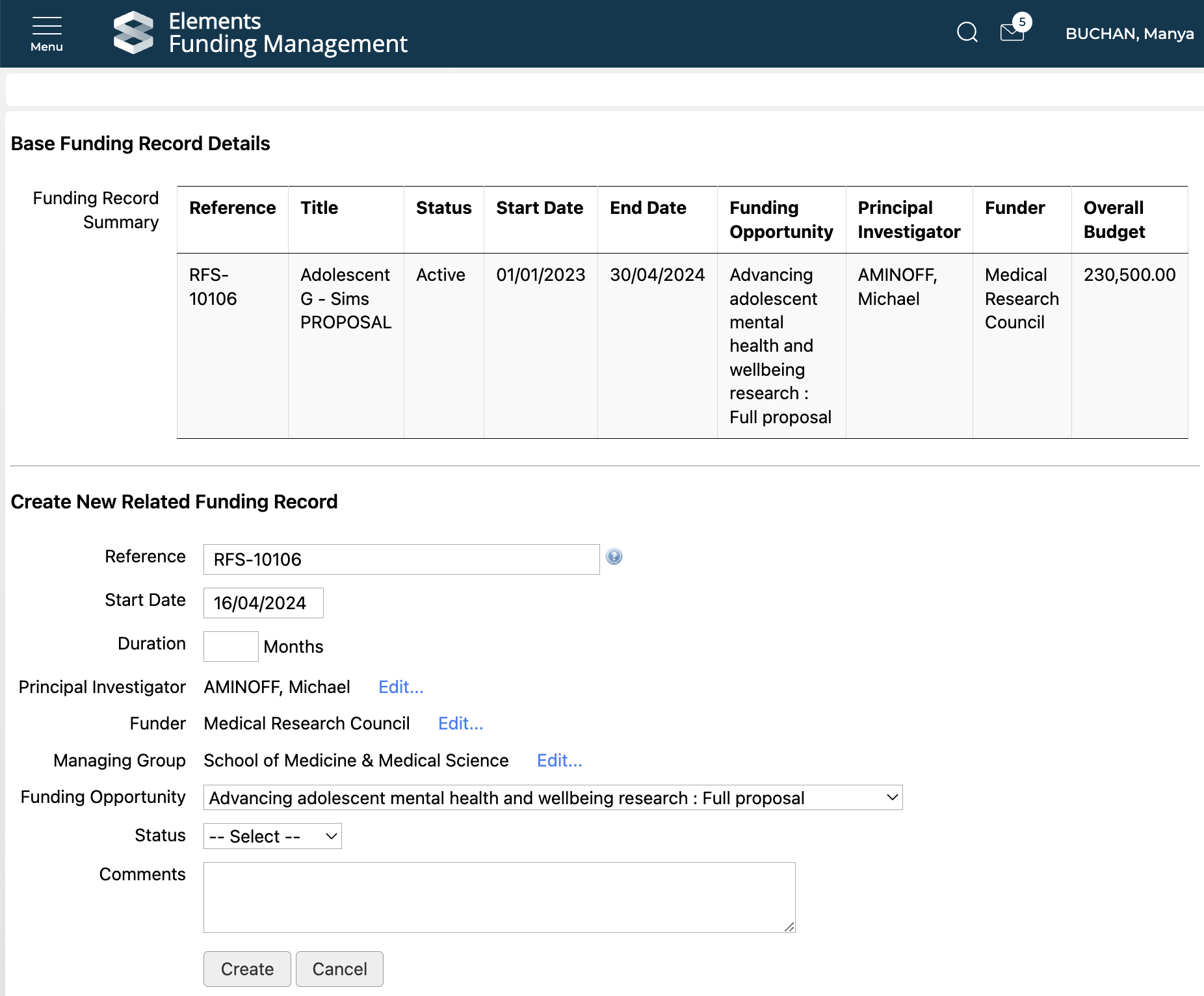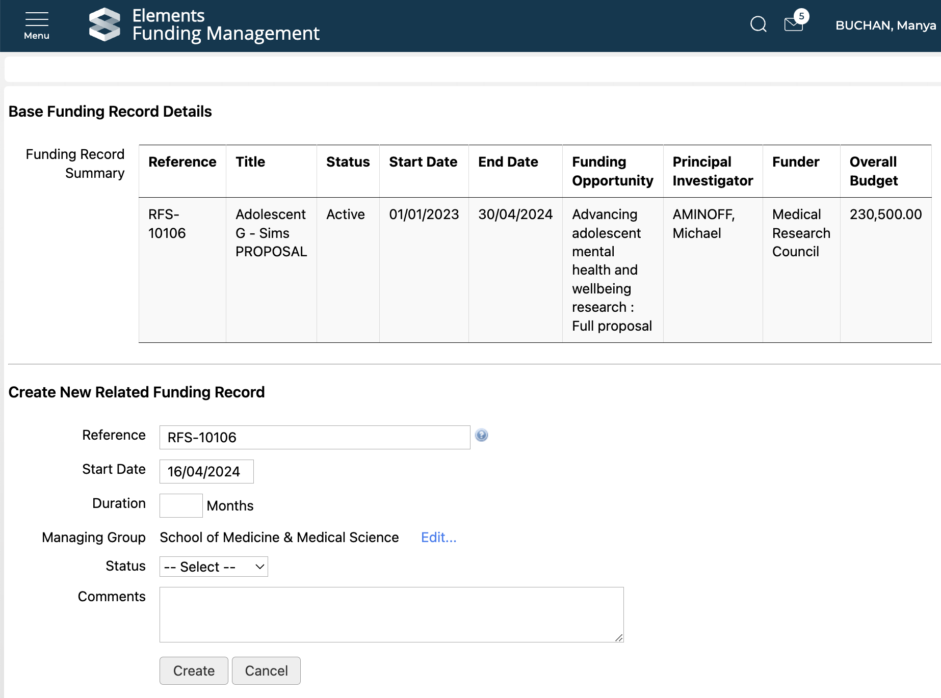 Once you select 'Create', you will be presented with an initial screen where you can capture specific properties on the sub-grant, as per the configured 'Fields to update' (see details here). The table at the top of the page summarises some key properties of the parent funding record.