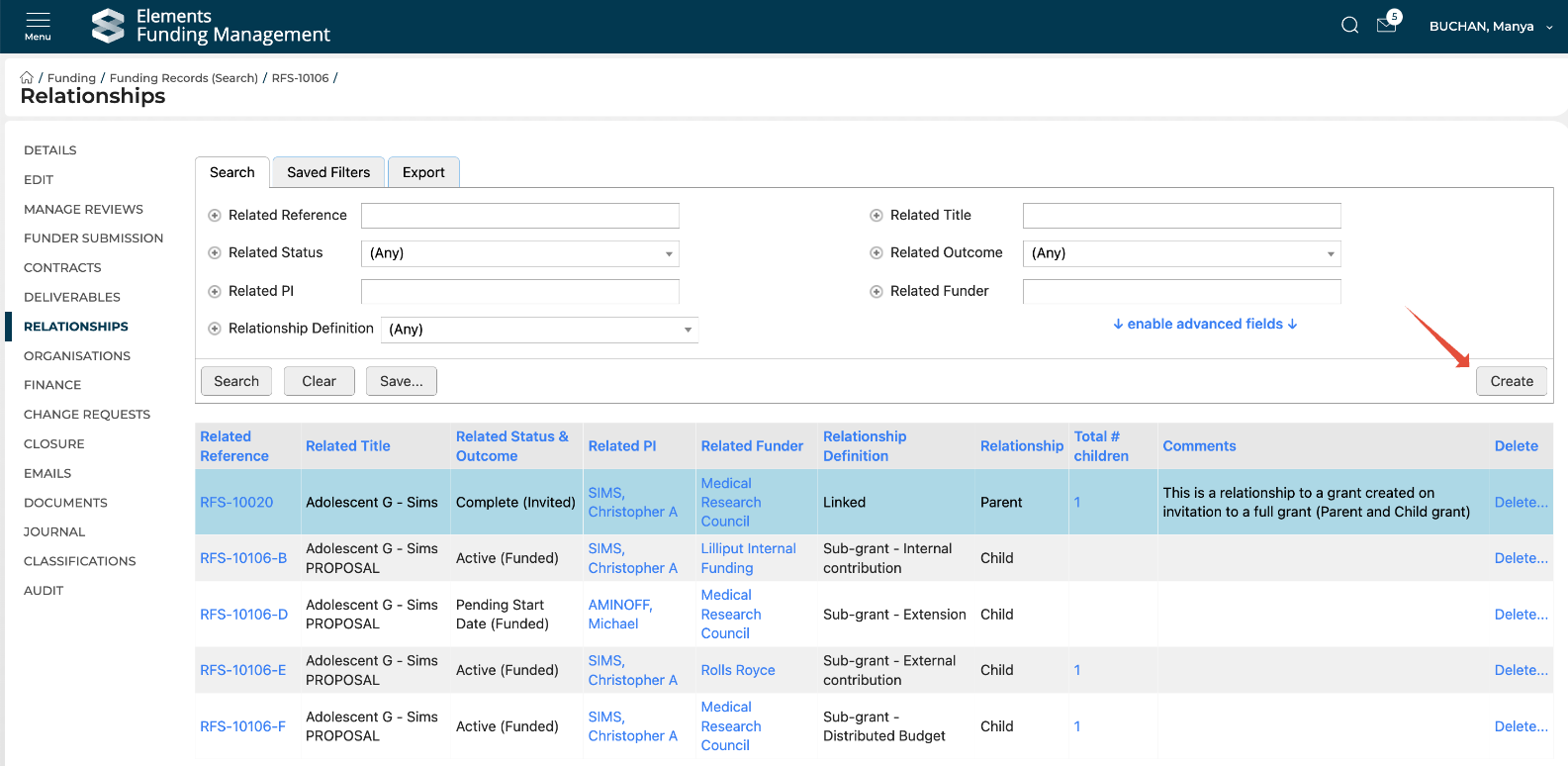 The Relationships page shows you all existing relationships (with that funding record's parent highlighted, where relevant) and enables you to create new ones, and delete existing ones.