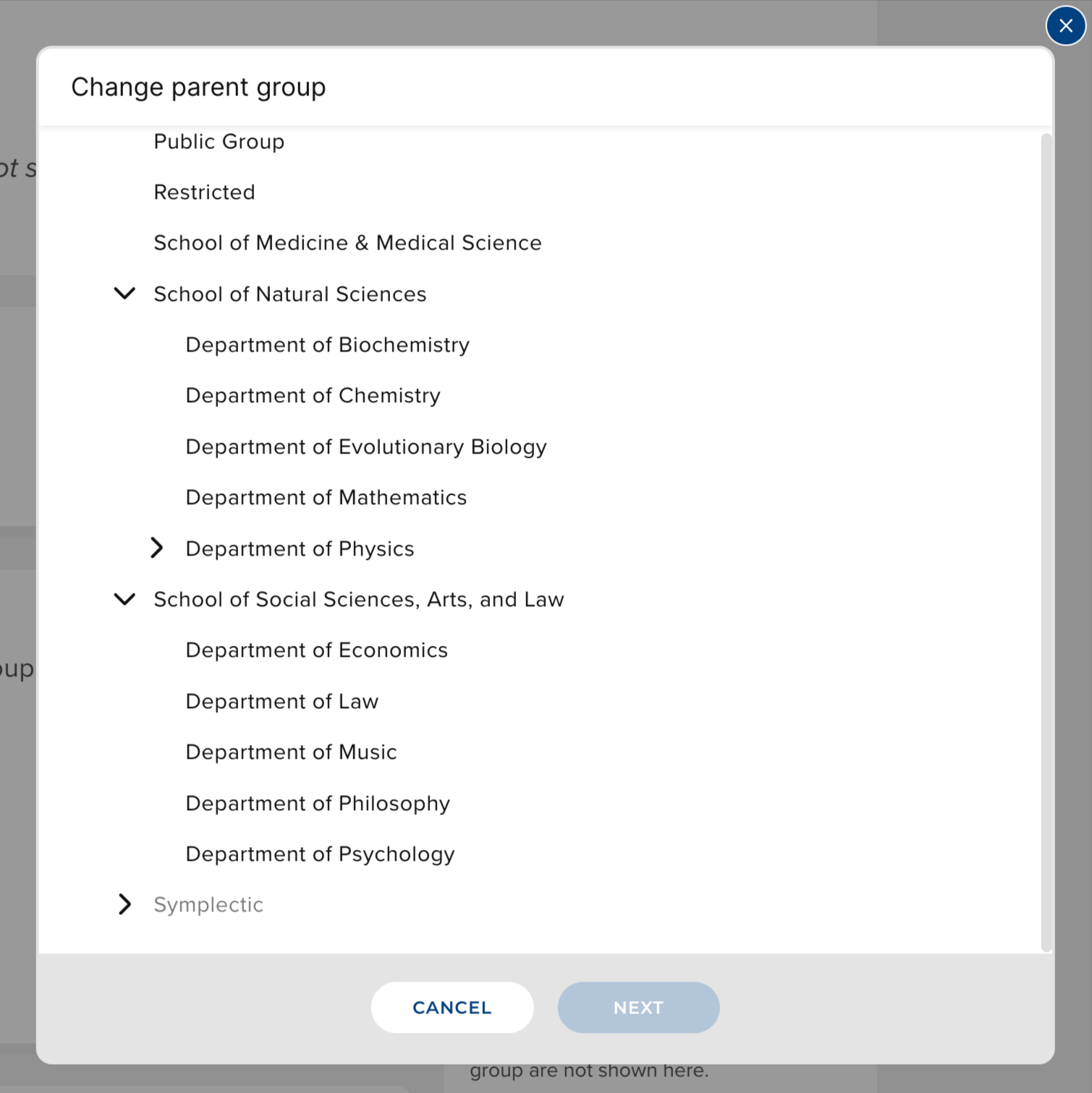 In order to change a group’s parent, you require permission to edit the group being moved, and the new parent. Changing a group’s parent may impact a number of important group properties. The option to change a group parent can be found in the menu option on the Group details page.