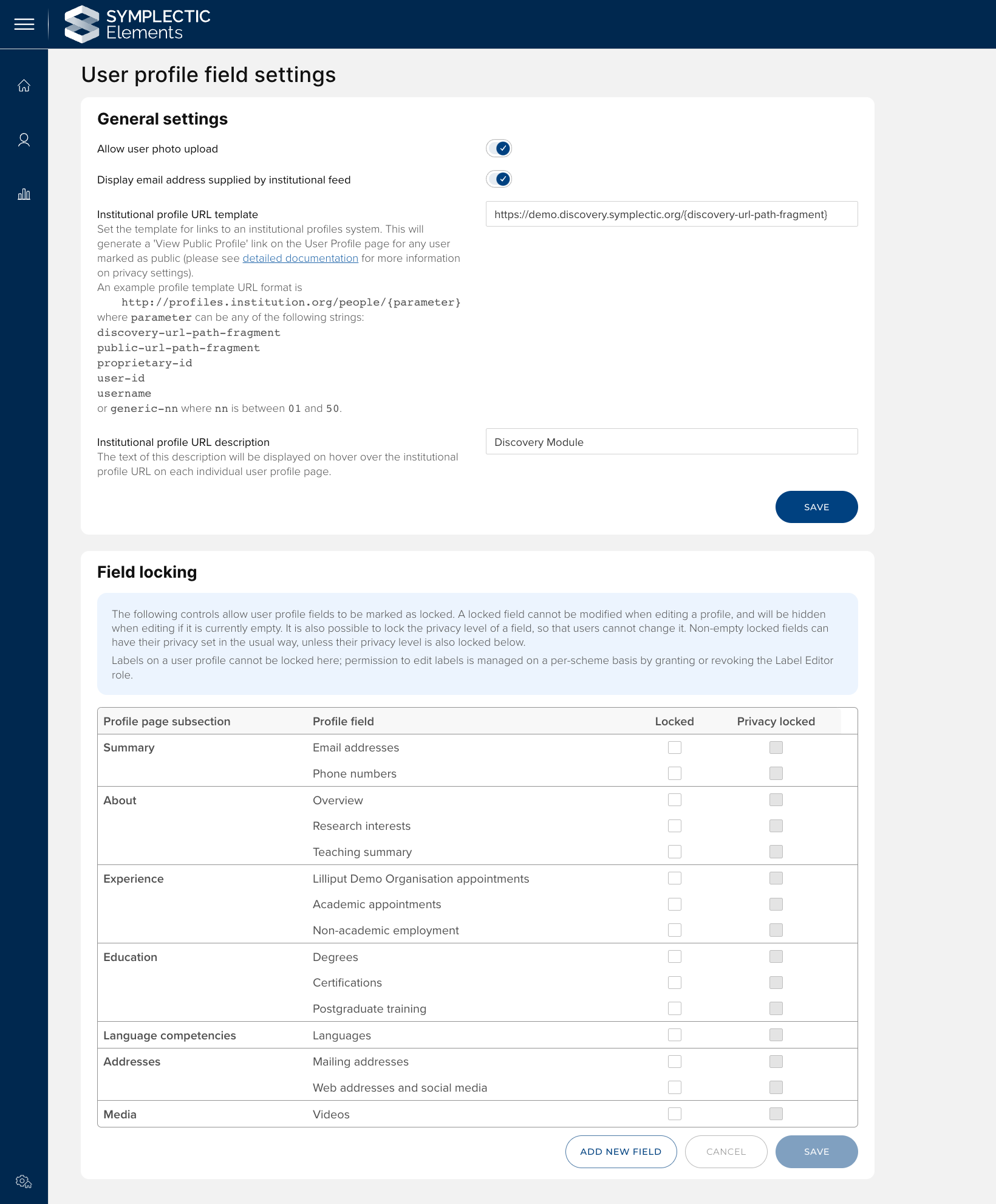 You can choose to consider additional text 'Summary' or Overview fields to appear on the Elements profile page and support the capture of alternative information about your users' experience or expertise. Examples for this could be: an alternative biography, to capture an impact summary or industry experience. To configure a new field, click the 'Add new field' button at the bottom of the page, and supply an underlying field name and display name for the field. Once created, the field will immediately become available to your users. You can also choose to lock custom fields if desired.