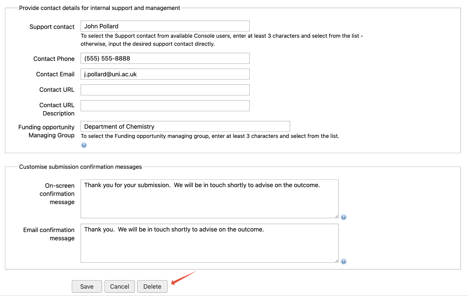 Where a Funding Opportunity has no associated Proposals or Projects, you can delete it via the Funding Opportunity > Edit page (at the bottom), in the Management Console. This feature enables you to delete Funding Opportunities that were created in error or for testing purposes.