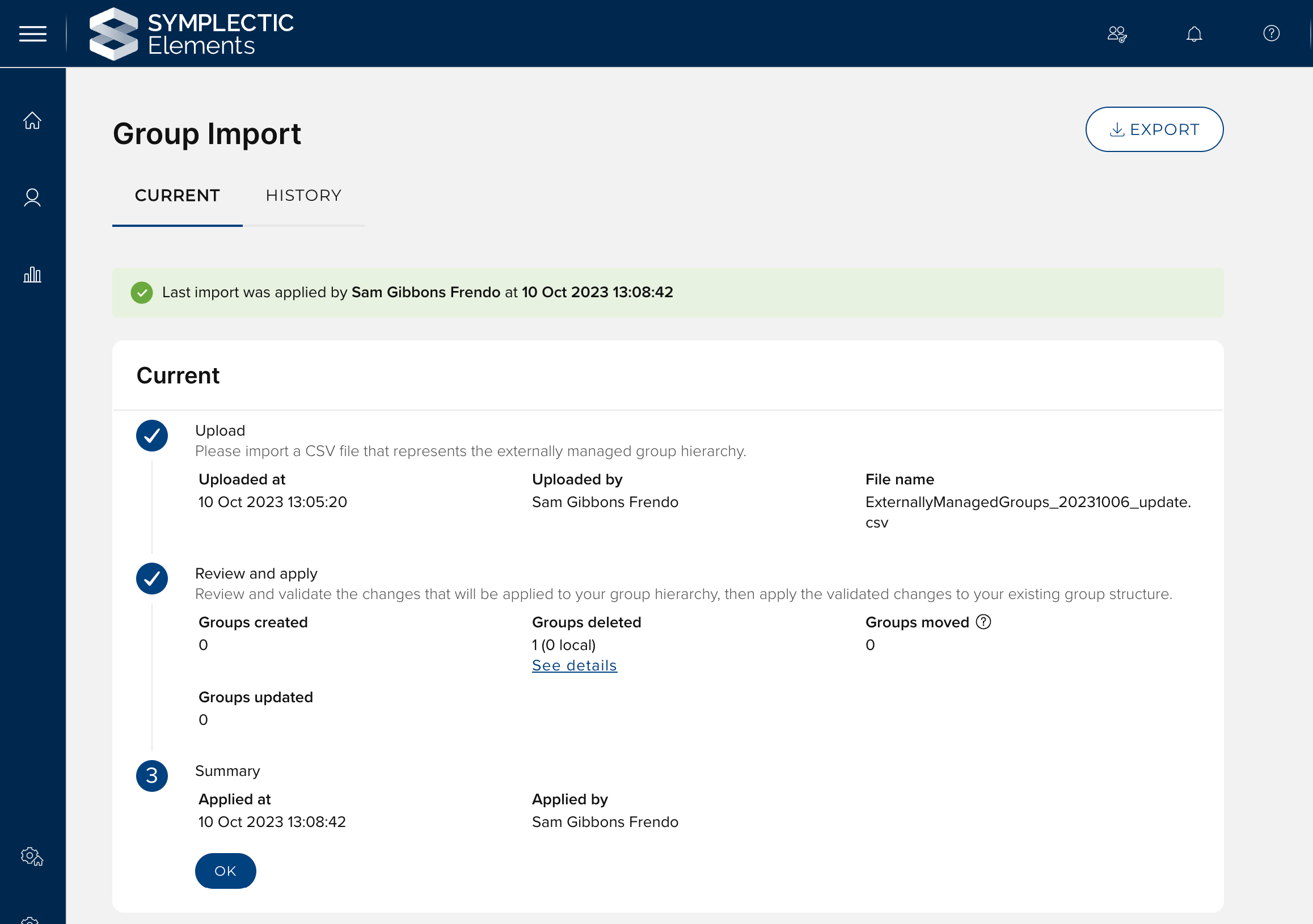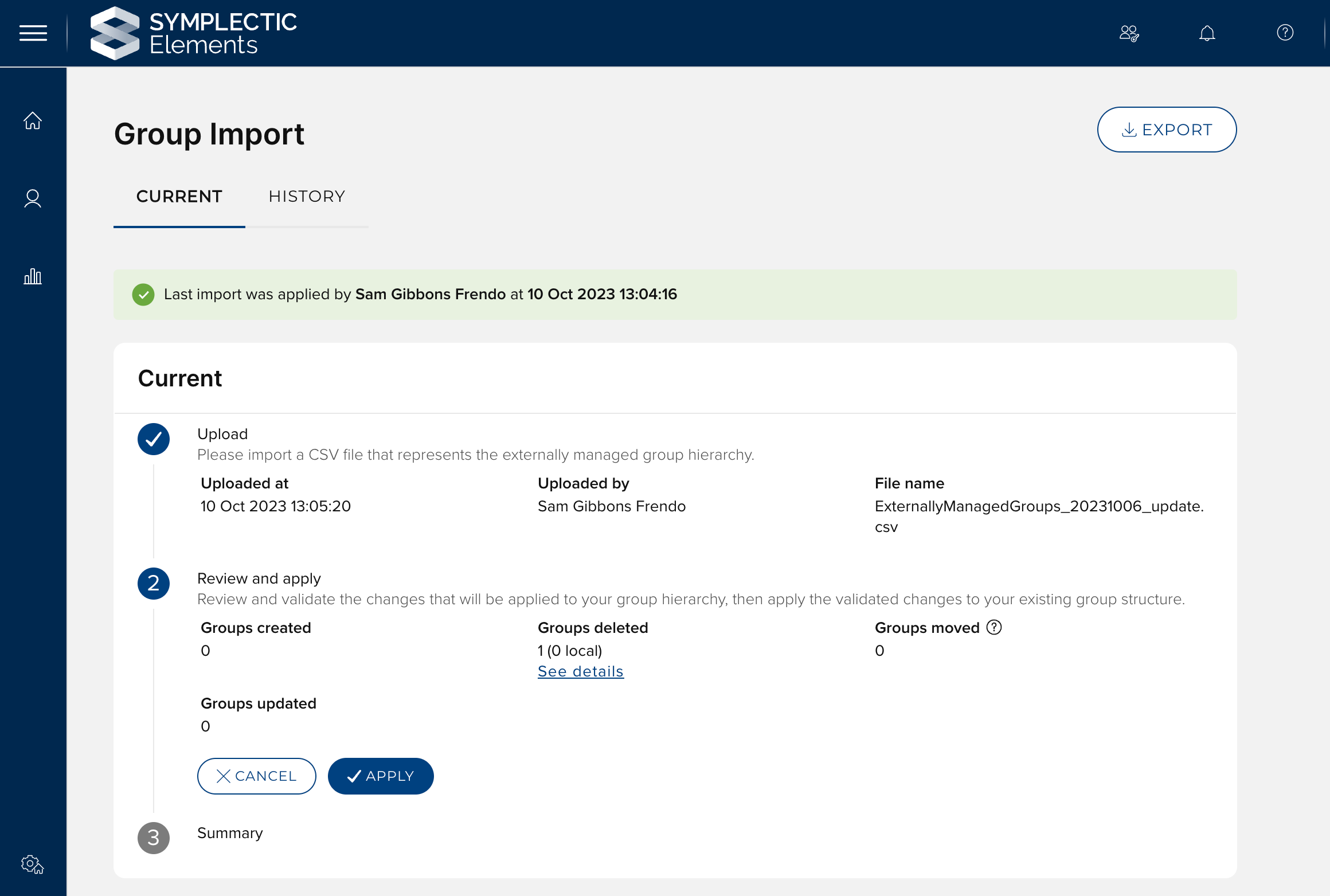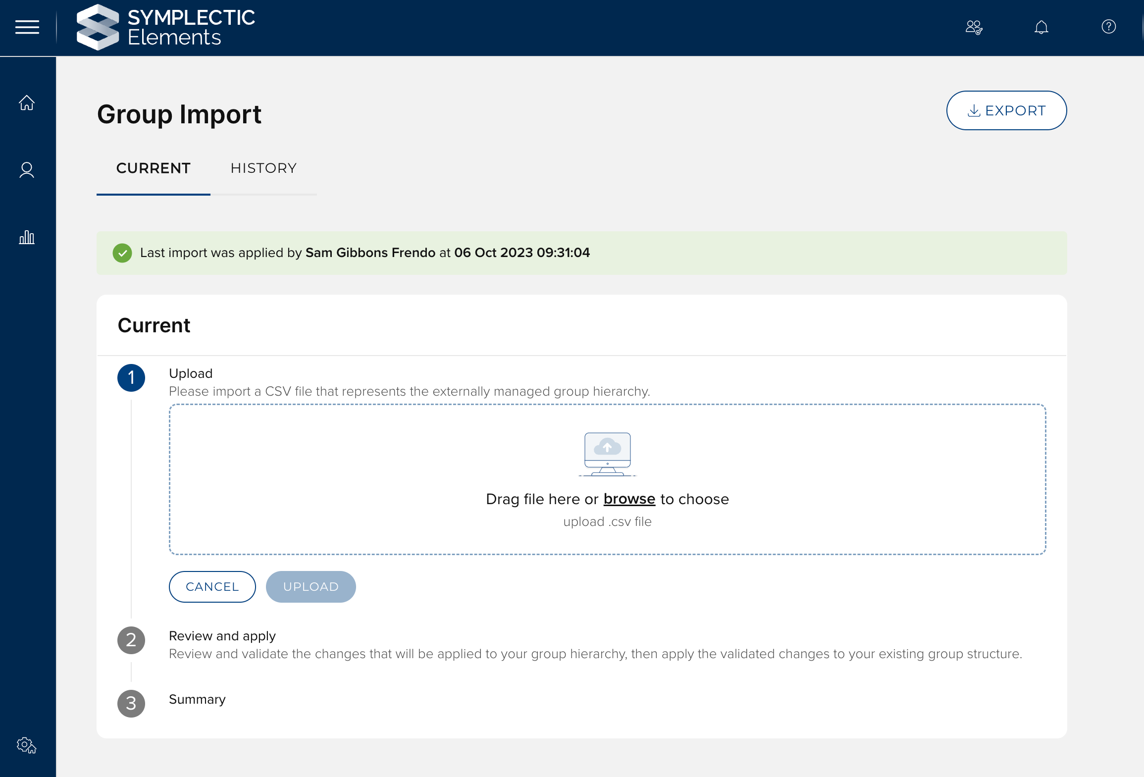 In the v6.15 release, the group importer supports the manual upload of a CSV file containing all data managed by the importer. Elements processes the imported file, and a high-level summary is displayed to administrators. To reduce the risk of unintended changes to group structure, a manual review and confirmation of the impact that the import will have is required prior to applying the changes.