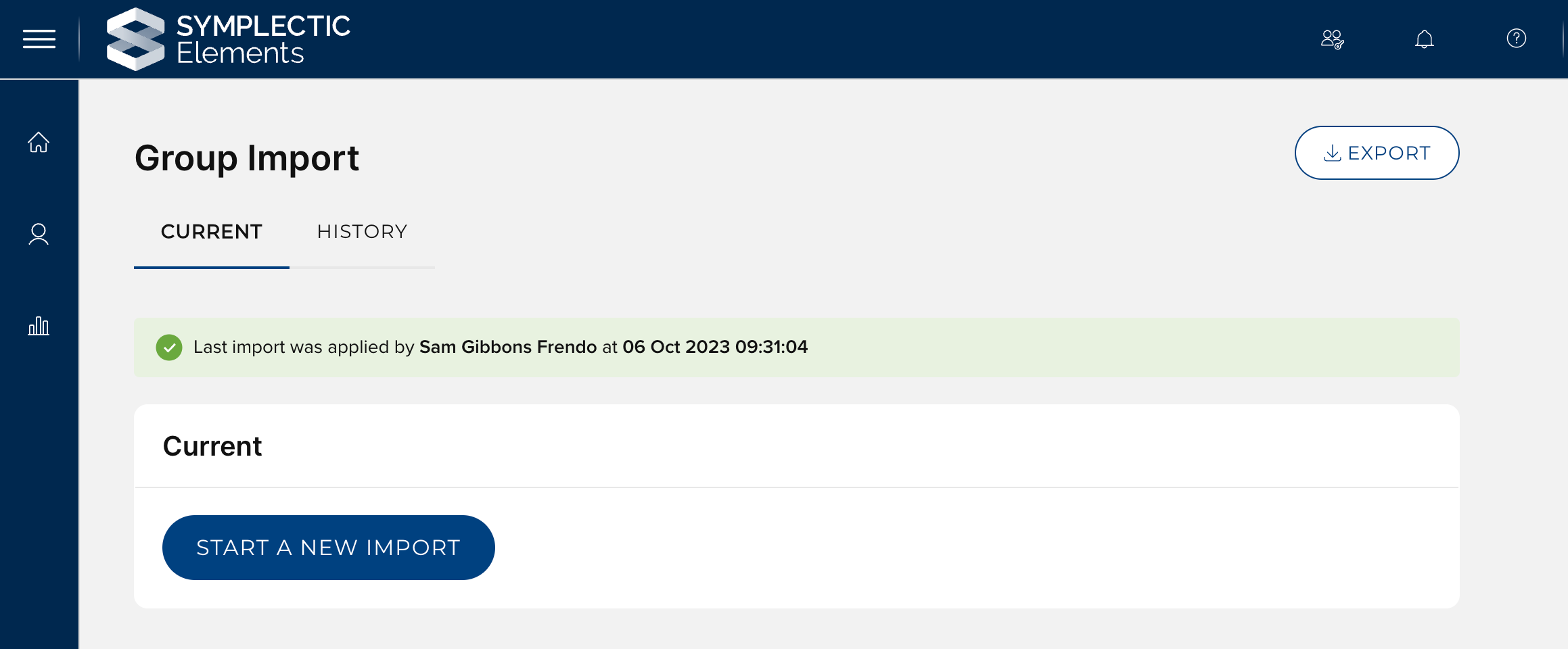 A new import of data is initiated by pressing the ‘Start a new import’ button on the Group Import page.