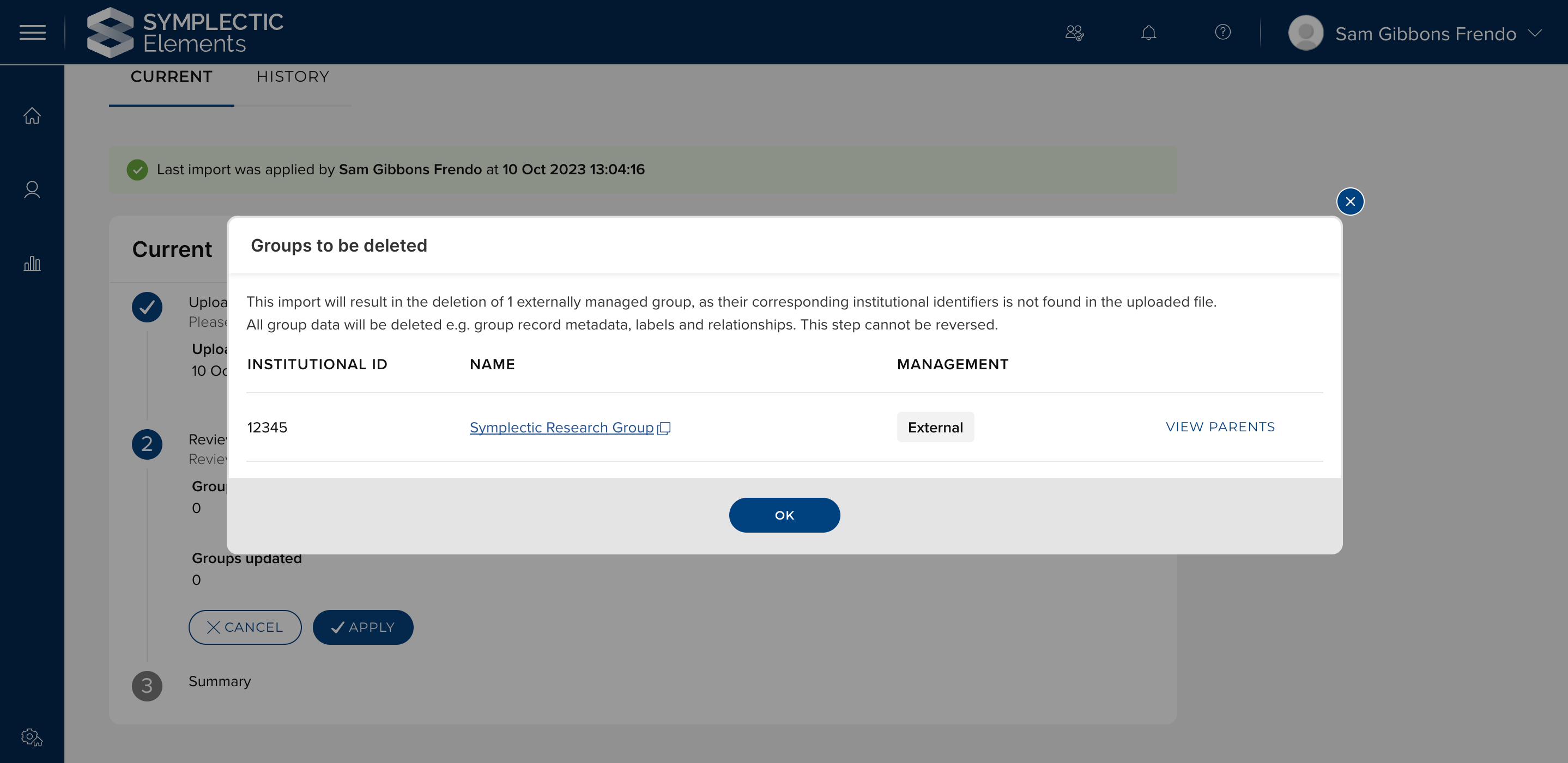 Groups deleted - A count of the number of existing groups that will be deleted if the import is applied. The ‘see details’ link will open a modal displaying the name and links to any groups that will be deleted. Note: Deleted groups cannot be recovered. Any data associated with the group (e.g. record metadata, labels, links etc.) will be permanently deleted.