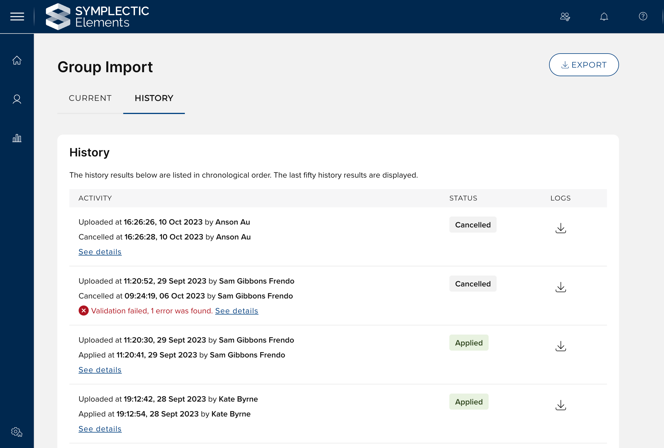 The history tab displays information on each completed import run, each cancelled import run and any import runs that error. This allows you to keep track of the historical activity of the group importer. For each history item it is possible to download a zip folder of history files. These files are intended to give you a complete picture of the import process. The first three files listed are associated with the ‘Load step’. If this fails, the remaining files will not be present.