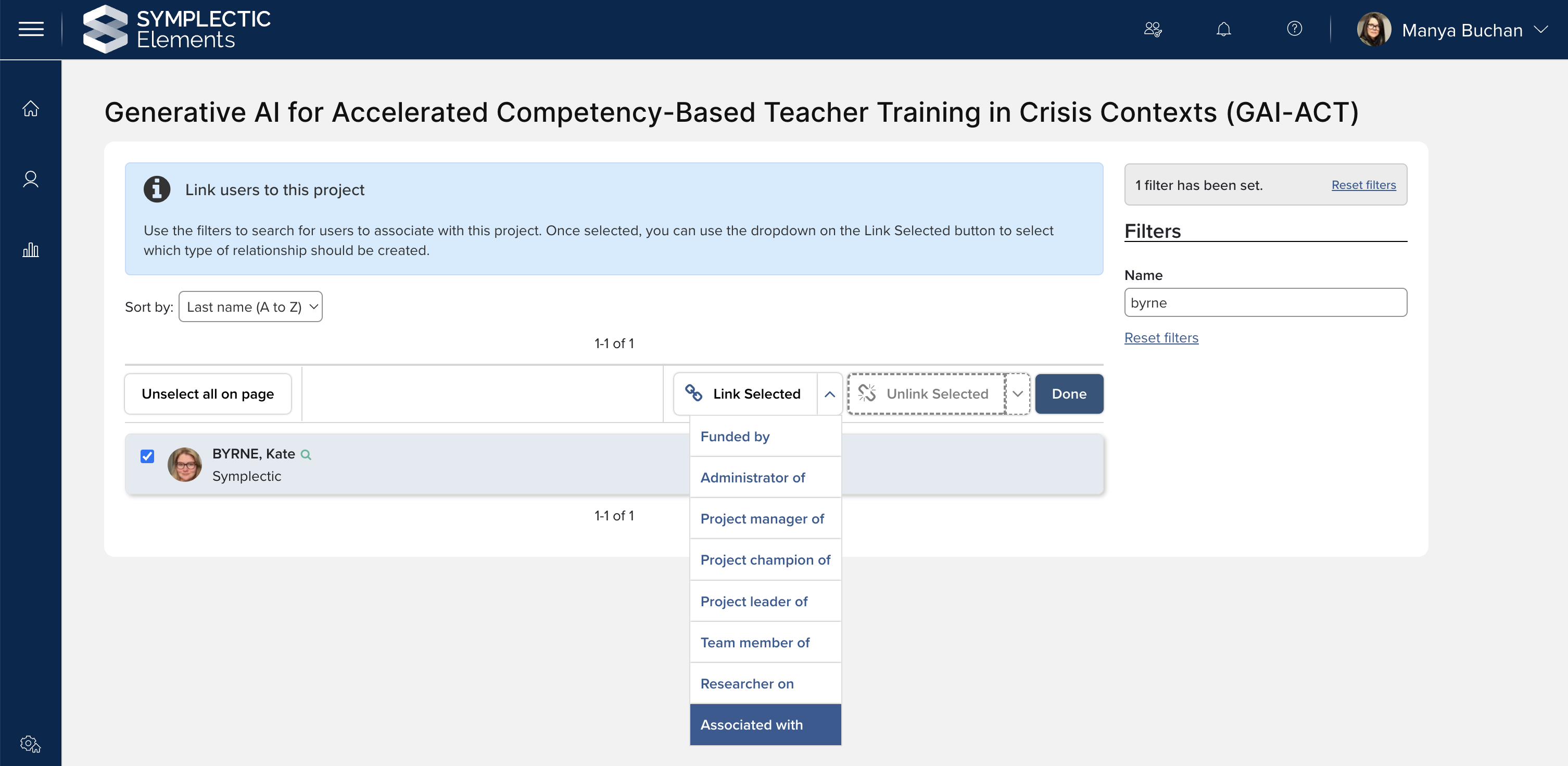 We have also introduced a new ‘associated with’ User - Project link type. This general purpose link helps to support the wider scope of the Projects module, allowing users with a more general association to the project to still be linked.