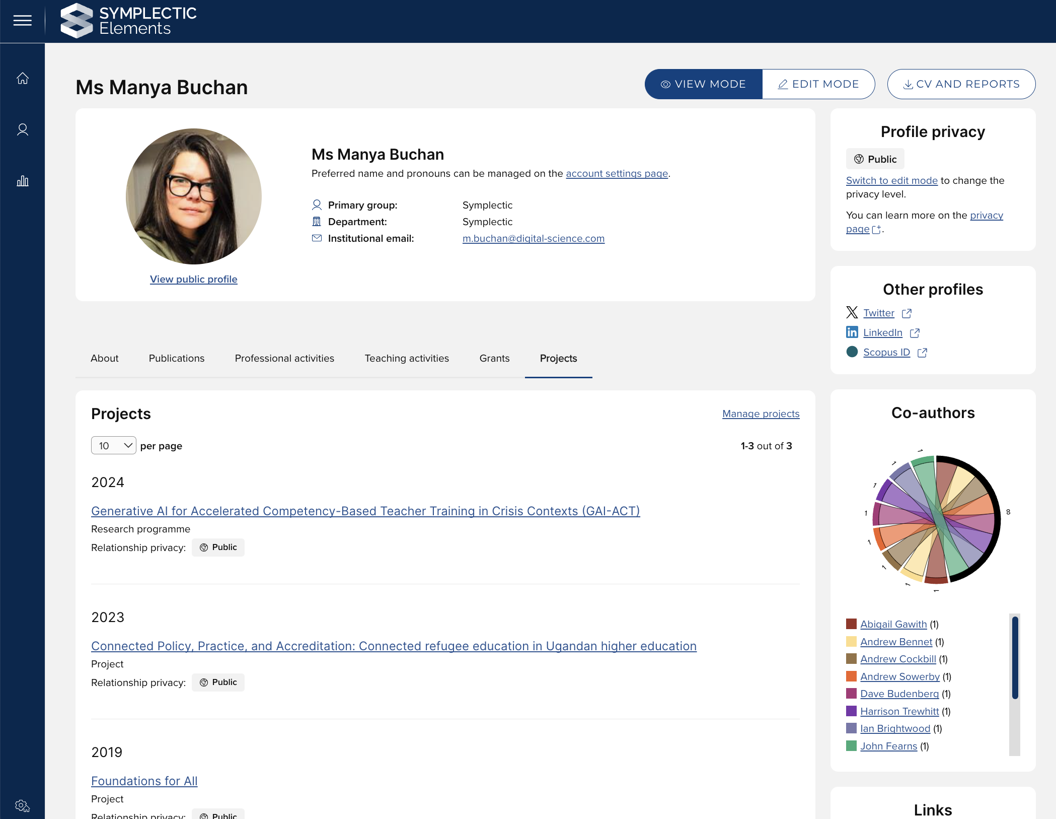 A new Projects tab in researcher profiles lets organisations showcase the data captured in the recently expanded Projects module. This adds a new dimension to profiles, highlighting researchers' participation in projects and helping to put their other outputs and activities into a wider context.