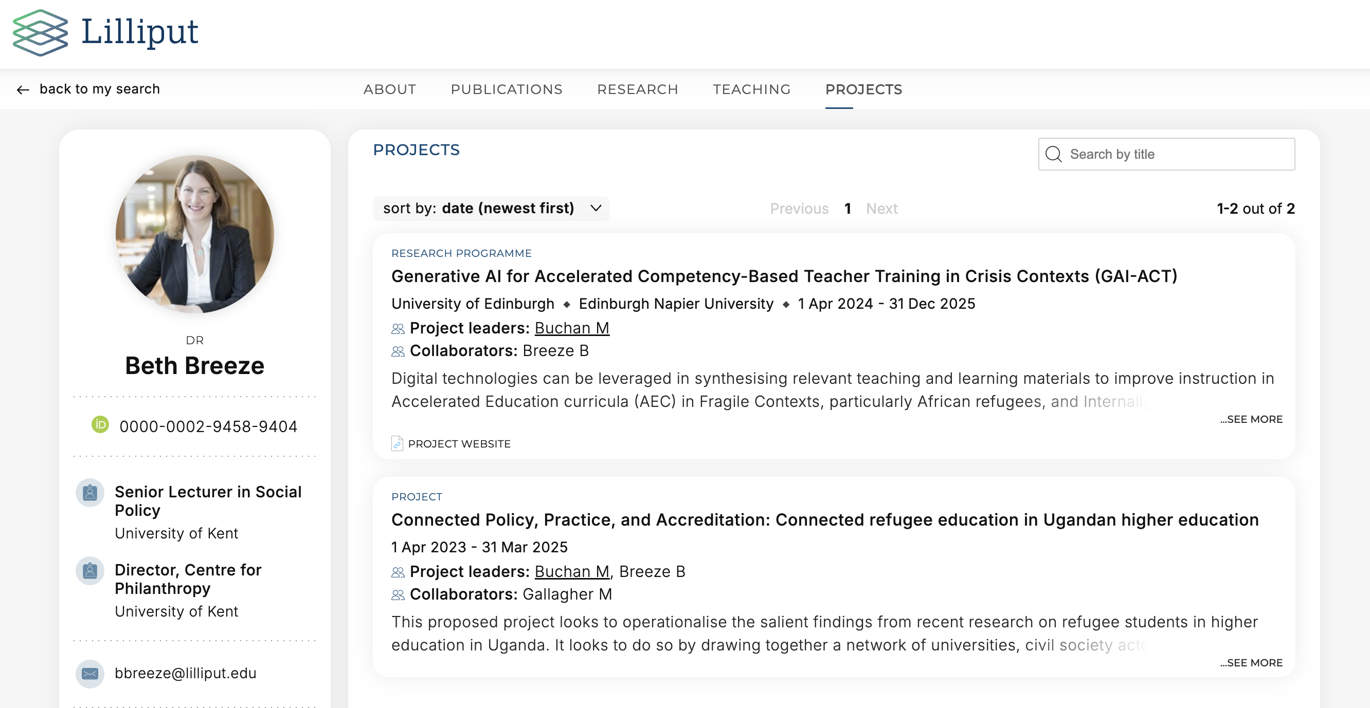Like other tabs on the Expert Profile Discovery, the tab can contain a list of projects, and also optionally display a ‘summary’ field which profiles an overarching description of their projects. This summary field can be populated with data from Elements, either by relocating the research interests field, or through the use of a custom user profile summary field.