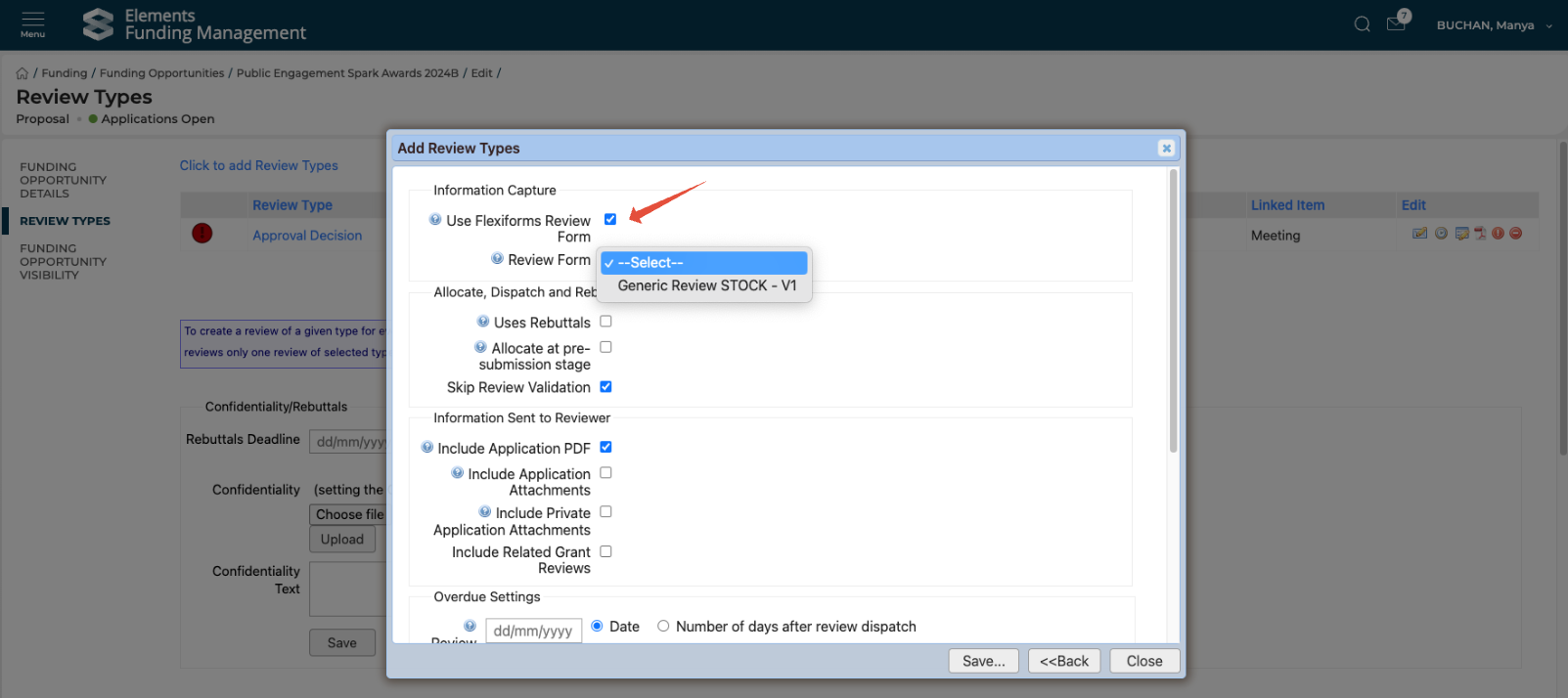 When creating a new Funding Opportunity, the 'Use Flexiforms Review Form' setting is automatically selected, helping to ensure accurate configuration when setting up reviews.
