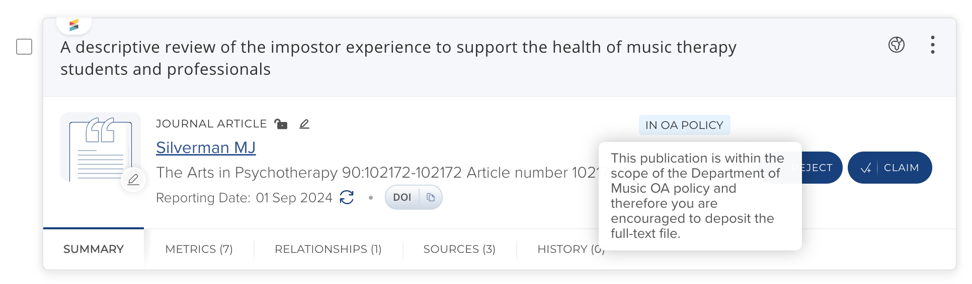 Image: Enabled 'In OA policy' setting on a publication