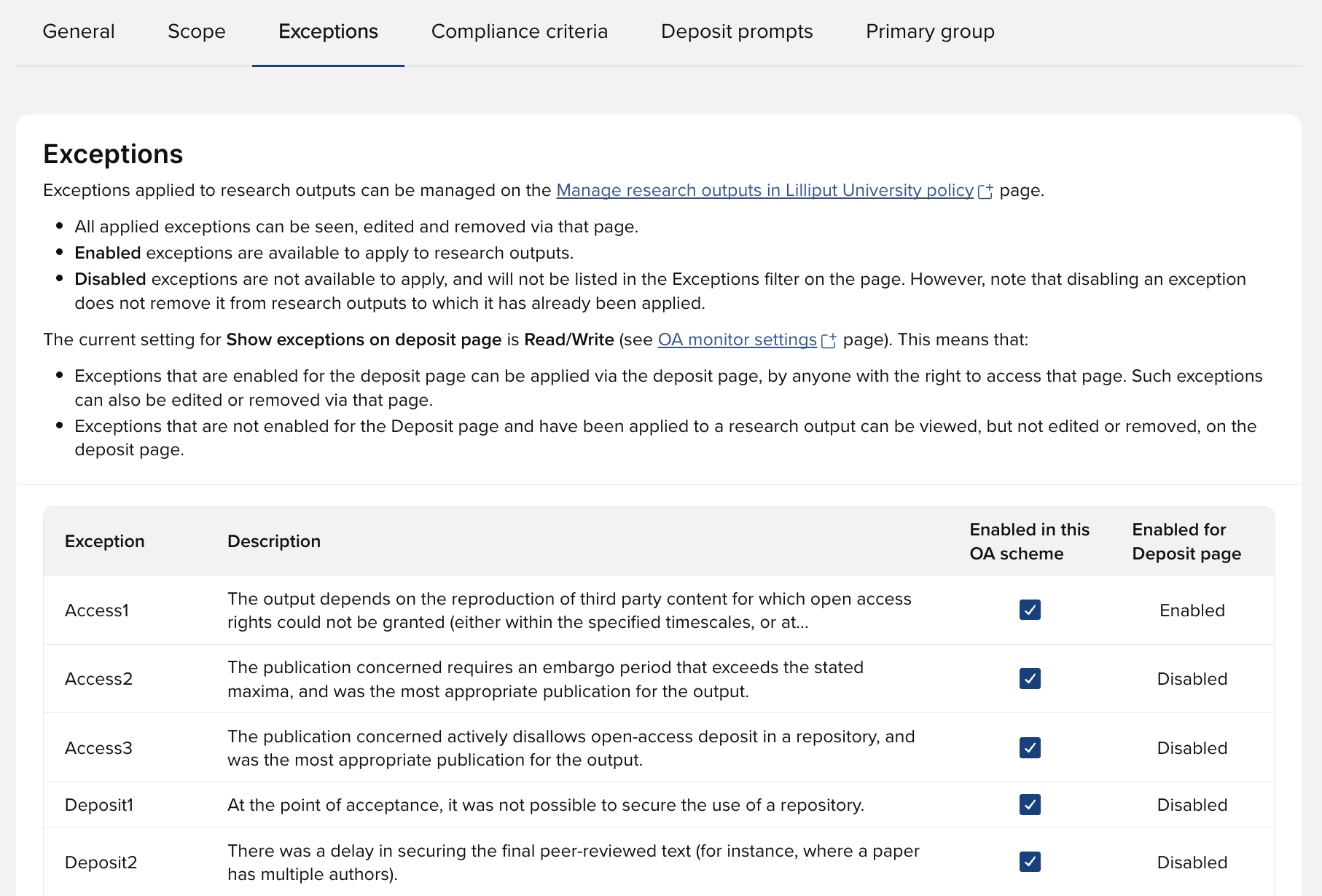 The list of exceptions available to enable is determined by the global OA Monitor settings, as is whether the exception is enabled is available to users on the deposit page.