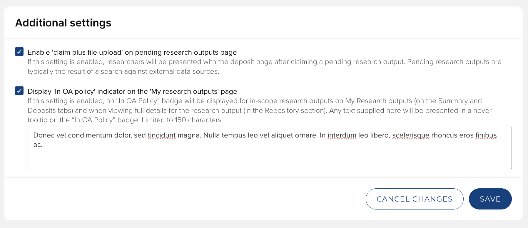 Indicate whether you wish to display the 'In OA policy' indicator on the 'My Publication's page. You can add hover text to provide the user with additional information.