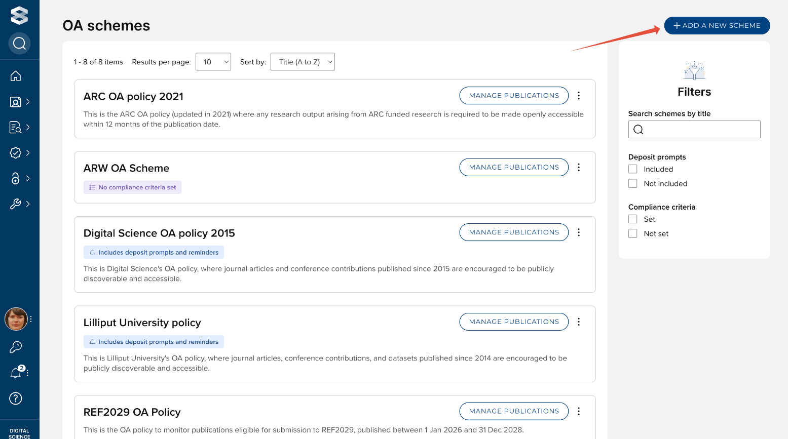 The OA schemes list page lists all OA schemes that have been configured in your instance of Elements. Schemes are tagged with key properties: