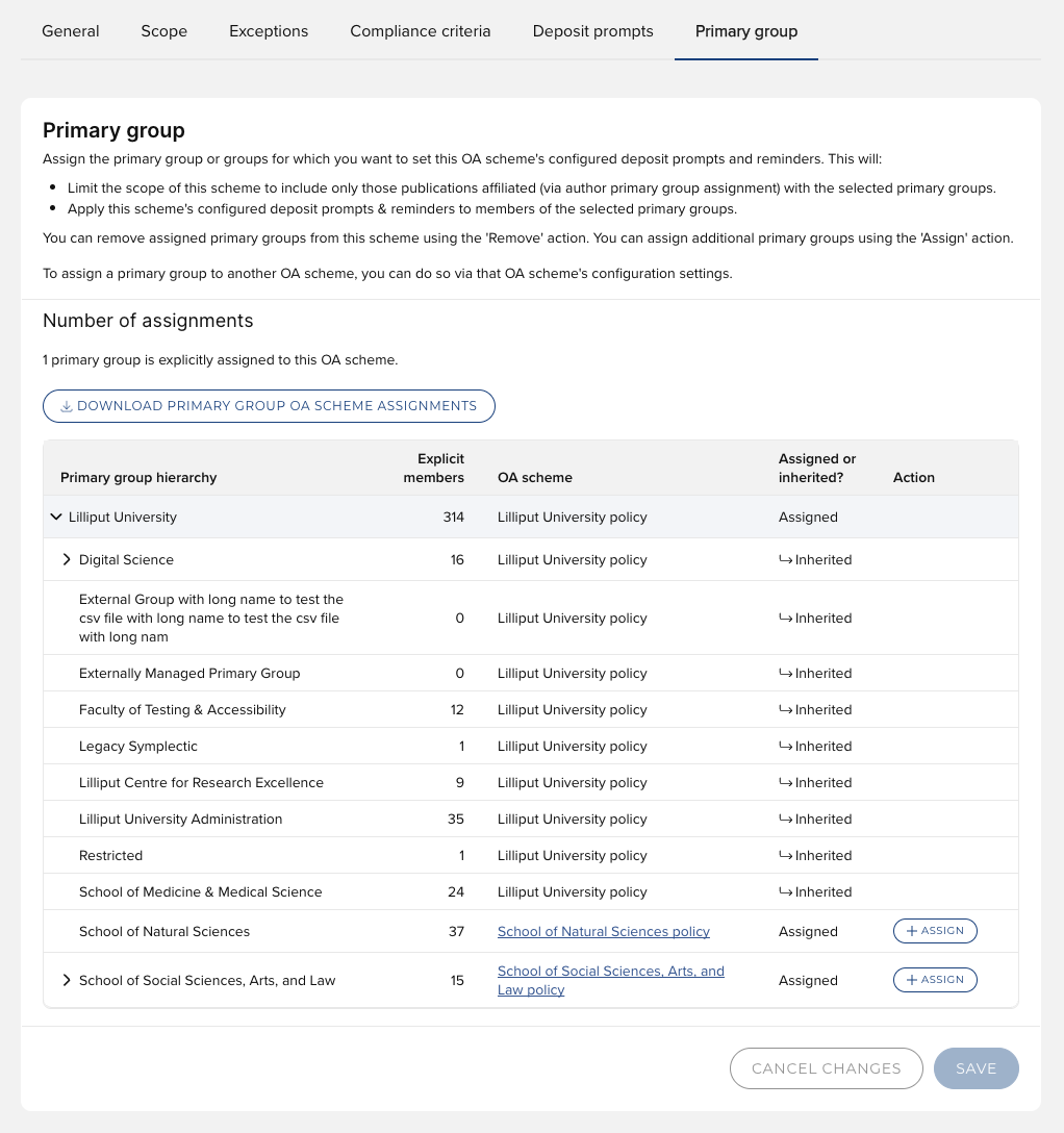 For each primary group, the table displays its current OA scheme assignment (if any), and whether that assignment is explicit ('Assigned') or inherited from a parent ('Inherited')