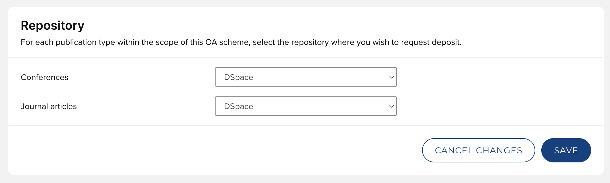 For each publication type within the scope of the OA scheme (as set in the Scope tab (see above)), select the repository where you wish to request deposit.