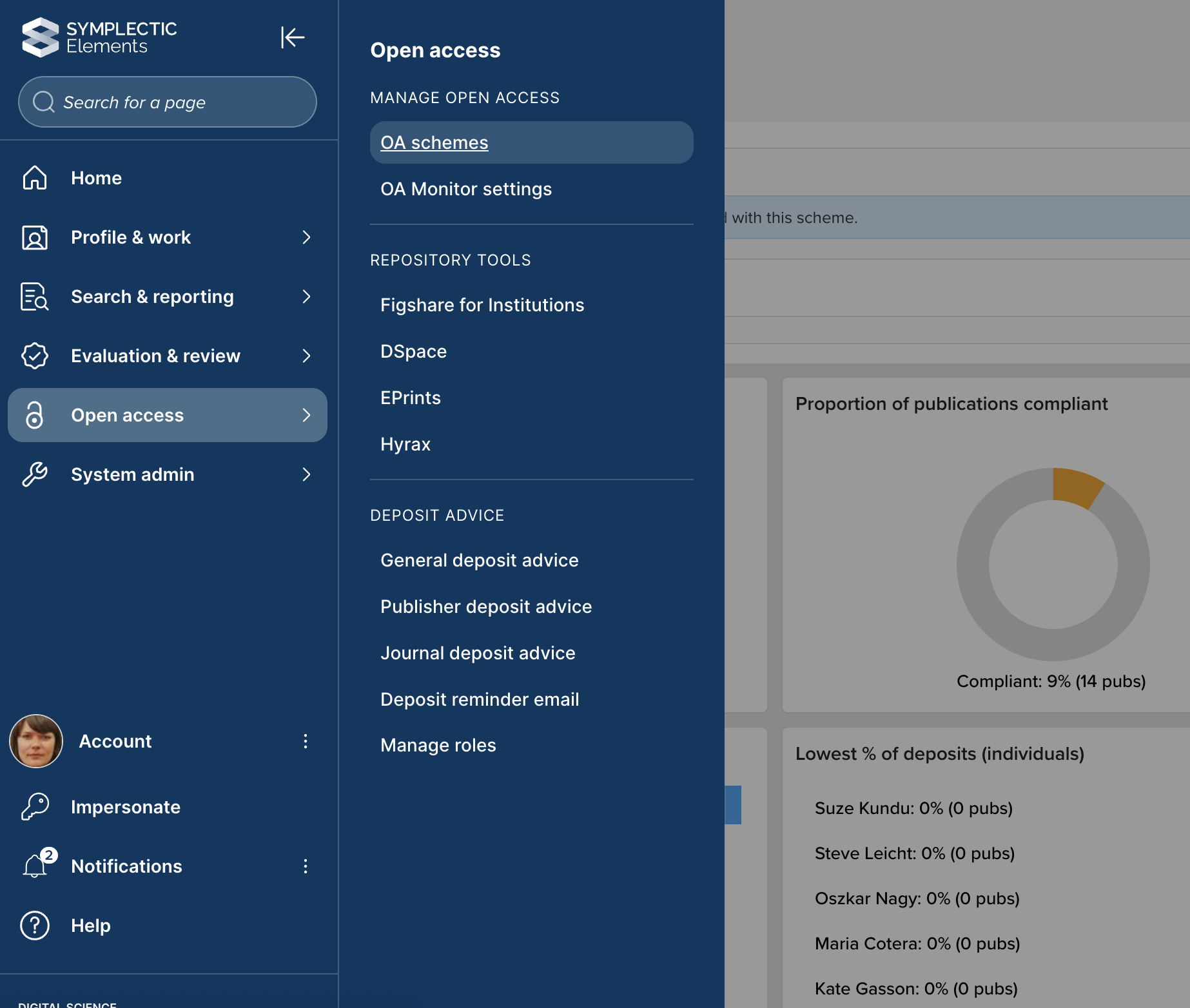 Image: Accessing OA schemes via the Elements navigation menu
