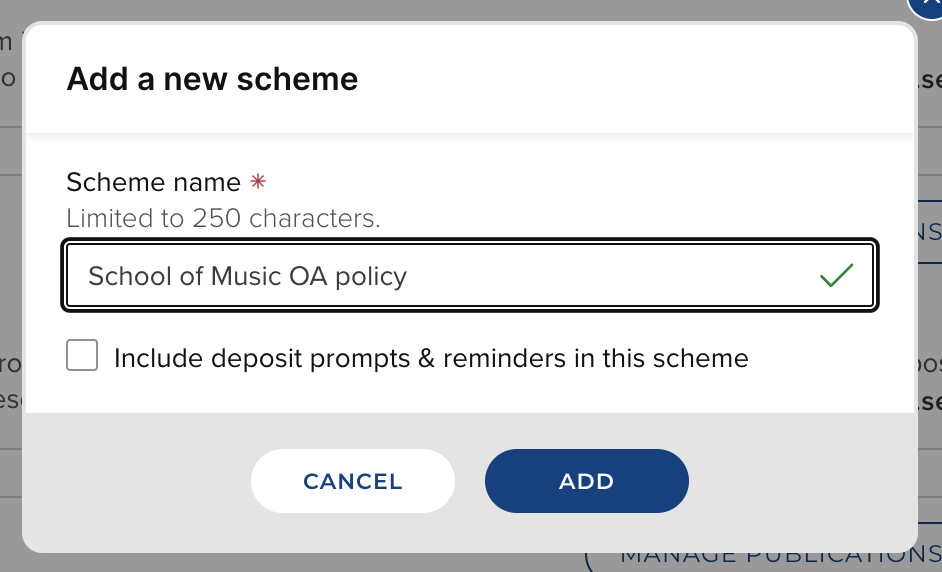 If this scheme is intended to prompt users to deposit publications that fall within the scope of the scheme, select the 'Include deposit prompts & reminders in this scheme' setting.