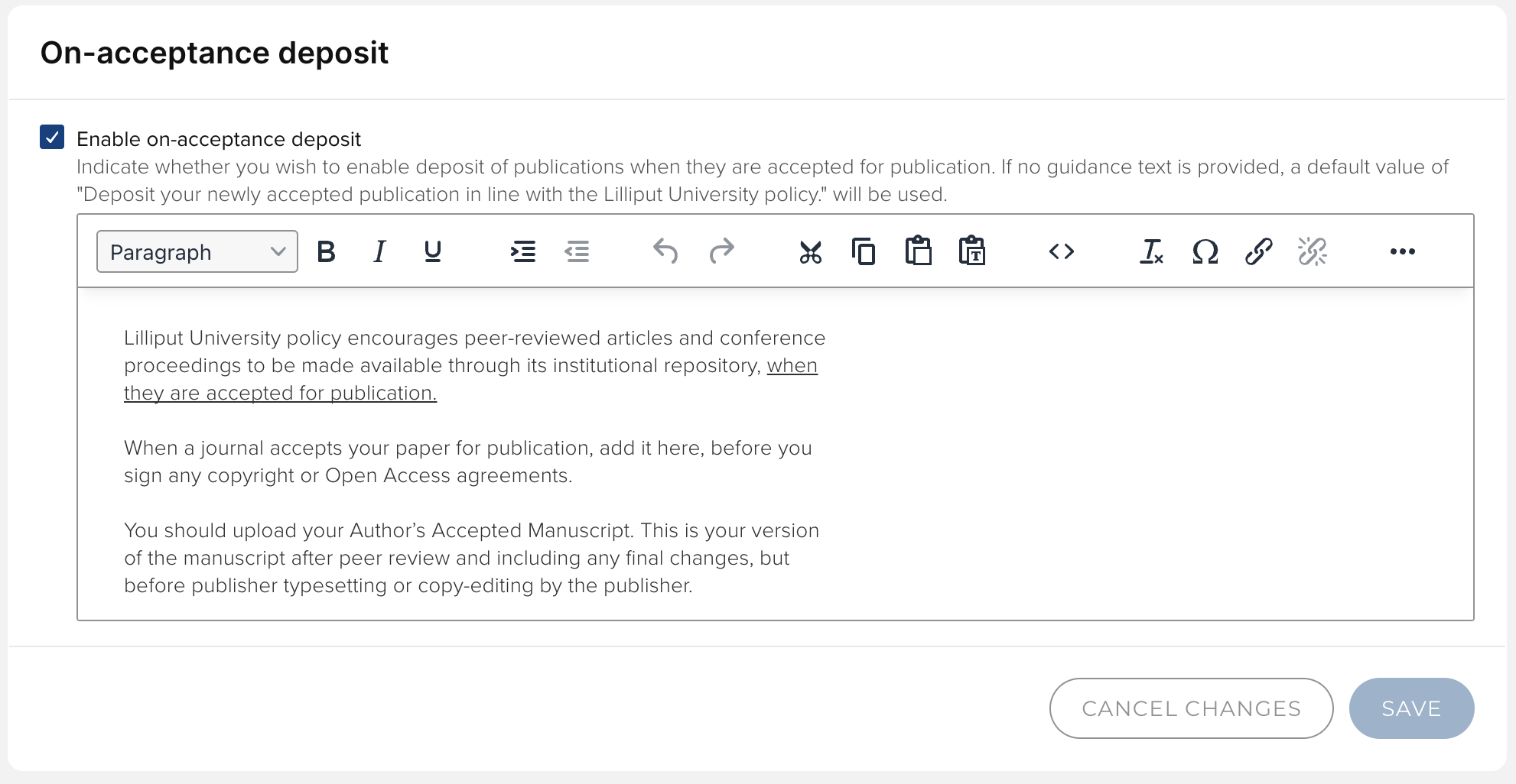 Use this tab to define the desired deposit prompts and guidance for publications within the scope of the OA scheme.