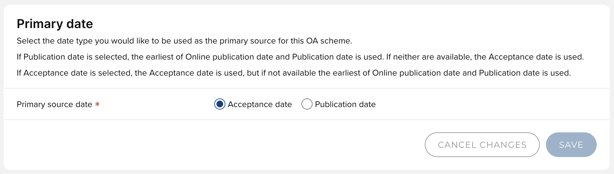 Select the date type you would like to be used as the primary source for this OA scheme.