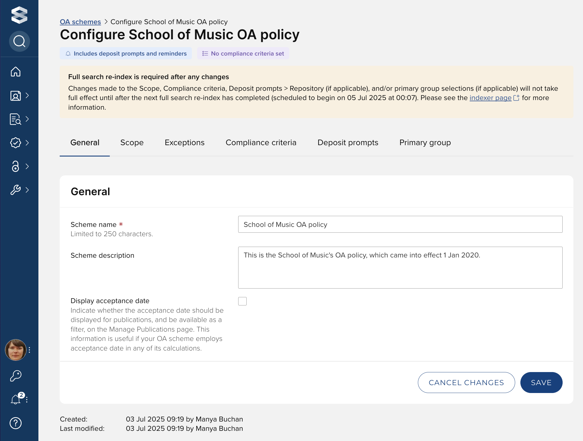 Note that changes made to the Scope, Compliance criteria, Deposit prompts > Repository (if applicable), and/or Primary group selections (if applicable) will not take full effect until after the next full search re-index has completed.