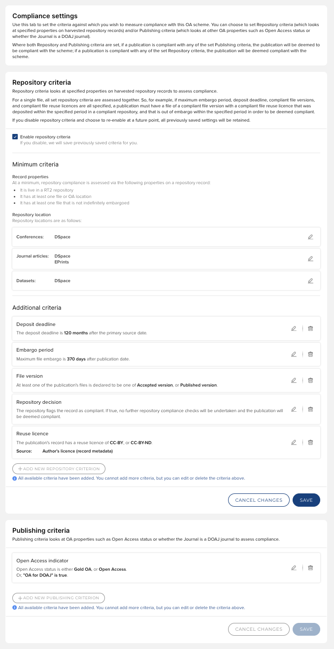 Use this page to set the criteria against which you wish to monitor compliance with the OA scheme. You can choose to set Repository criteria (which looks at specified properties on harvested repository records) and/or Publishing criteria (which looks at other 'native' OA properties).
