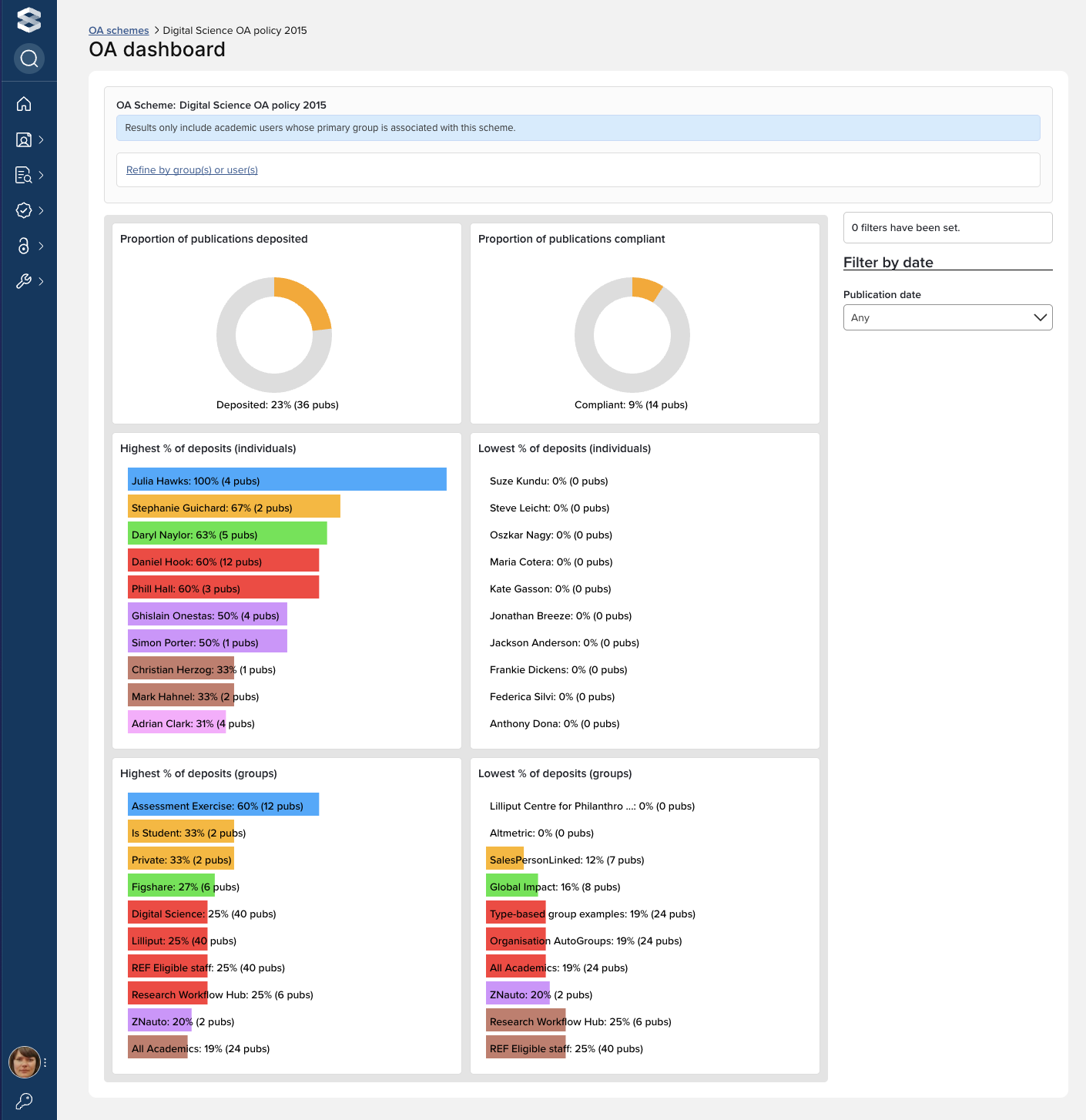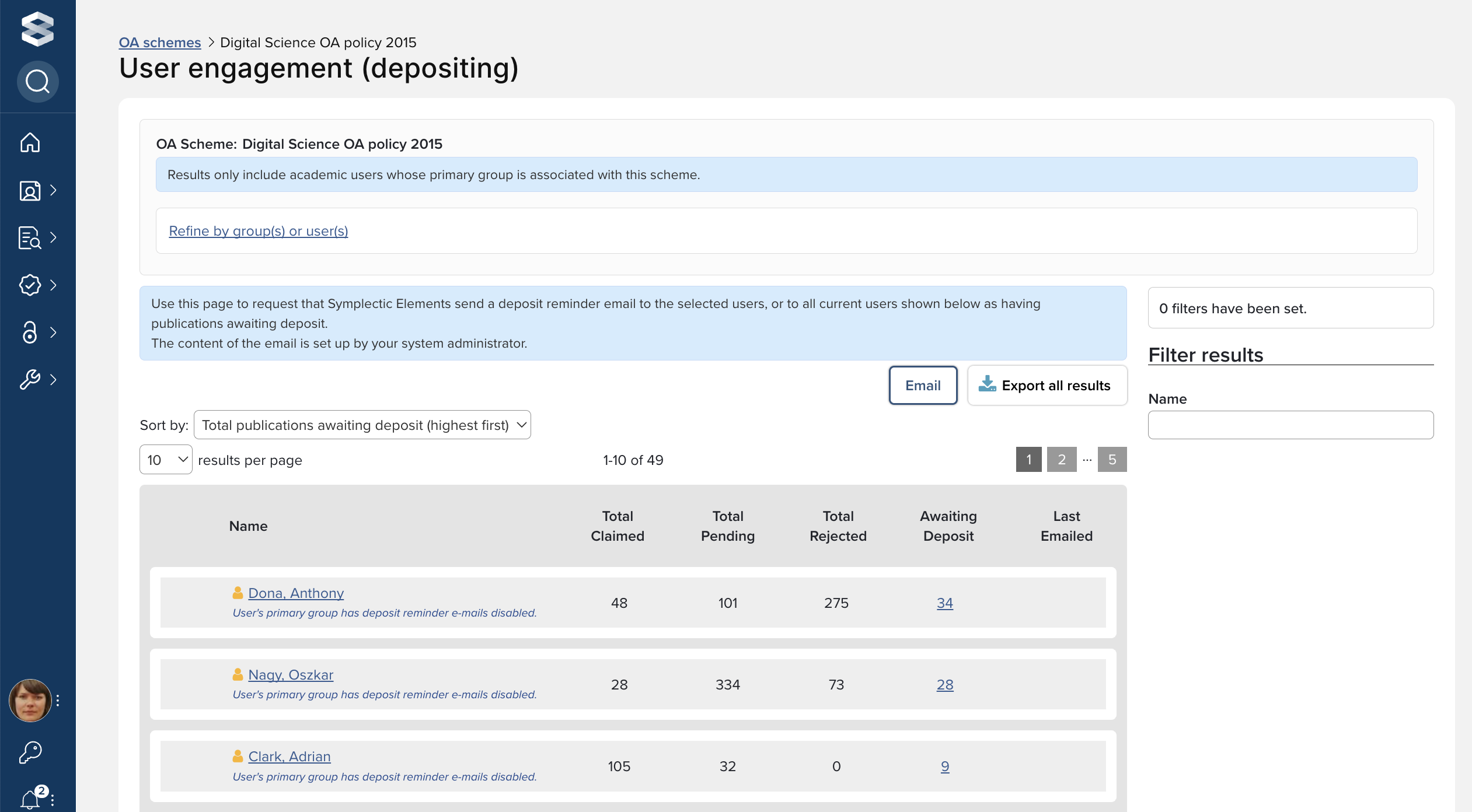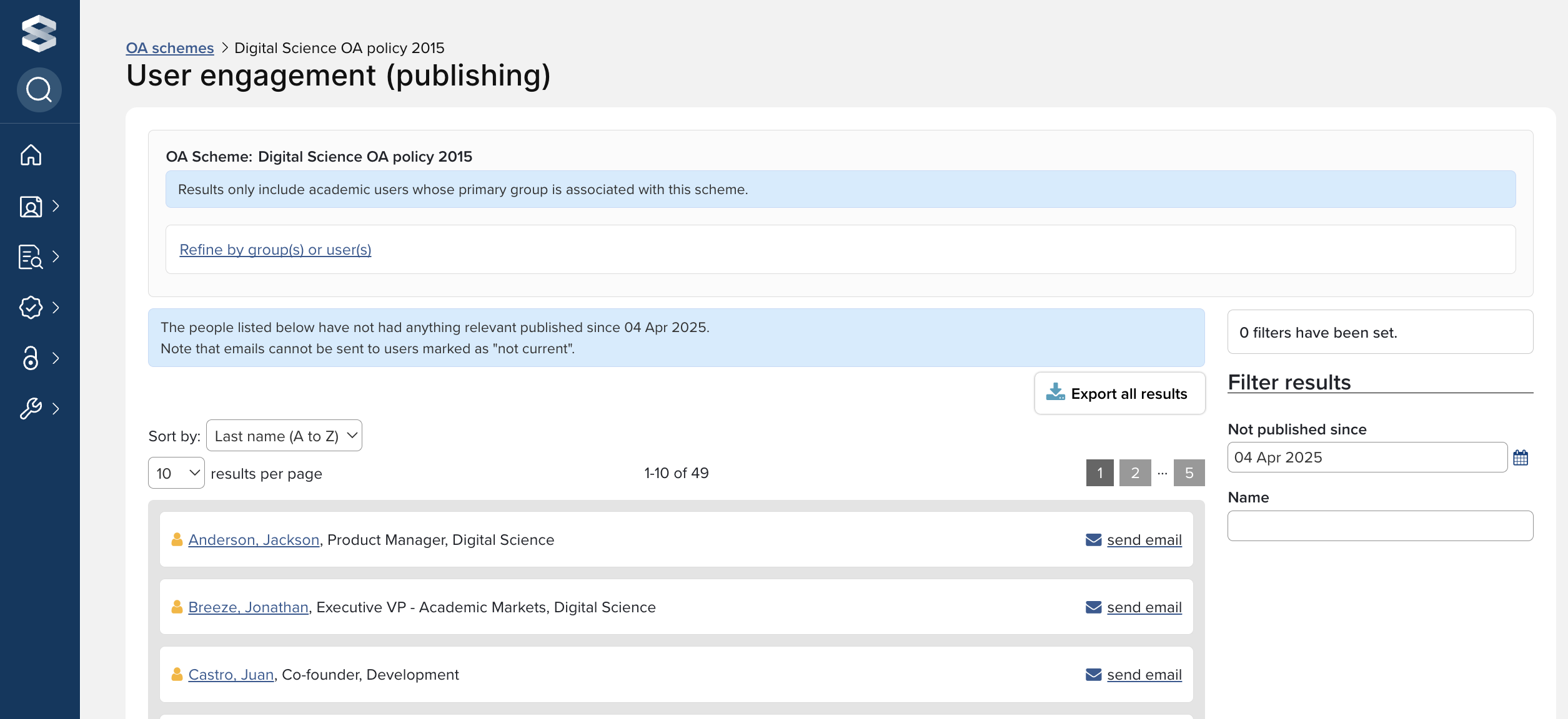 The User Engagement (Publishing) page lists those users within the scope of the OA scheme who have not had any relevant publications accepted in the past 3 months (default filter). From this page you can export the list of users, or email individuals.