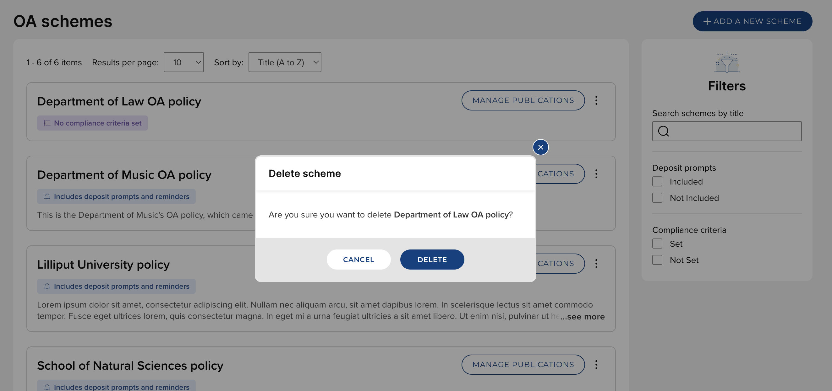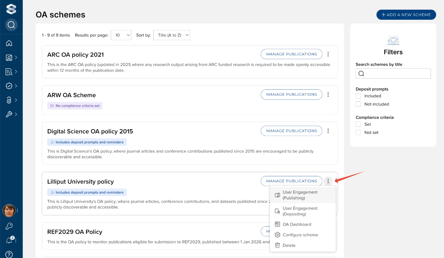 The OA schemes list page lists all OA schemes that have been configured in your instance of Elements.