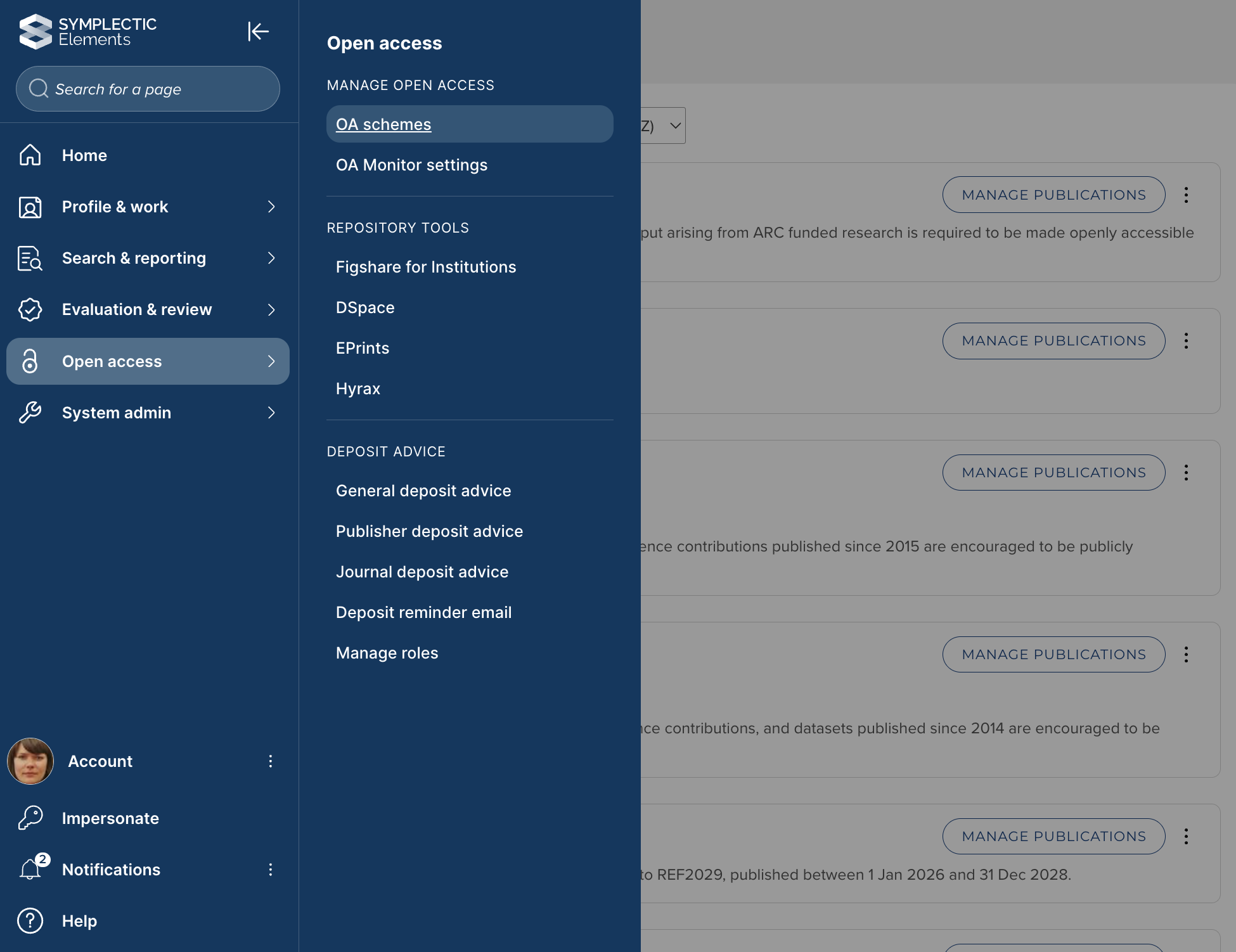 OA schemes can be accessed by authorised users via Open Access > [MANAGE OPEN ACCESS] > OA schemes.