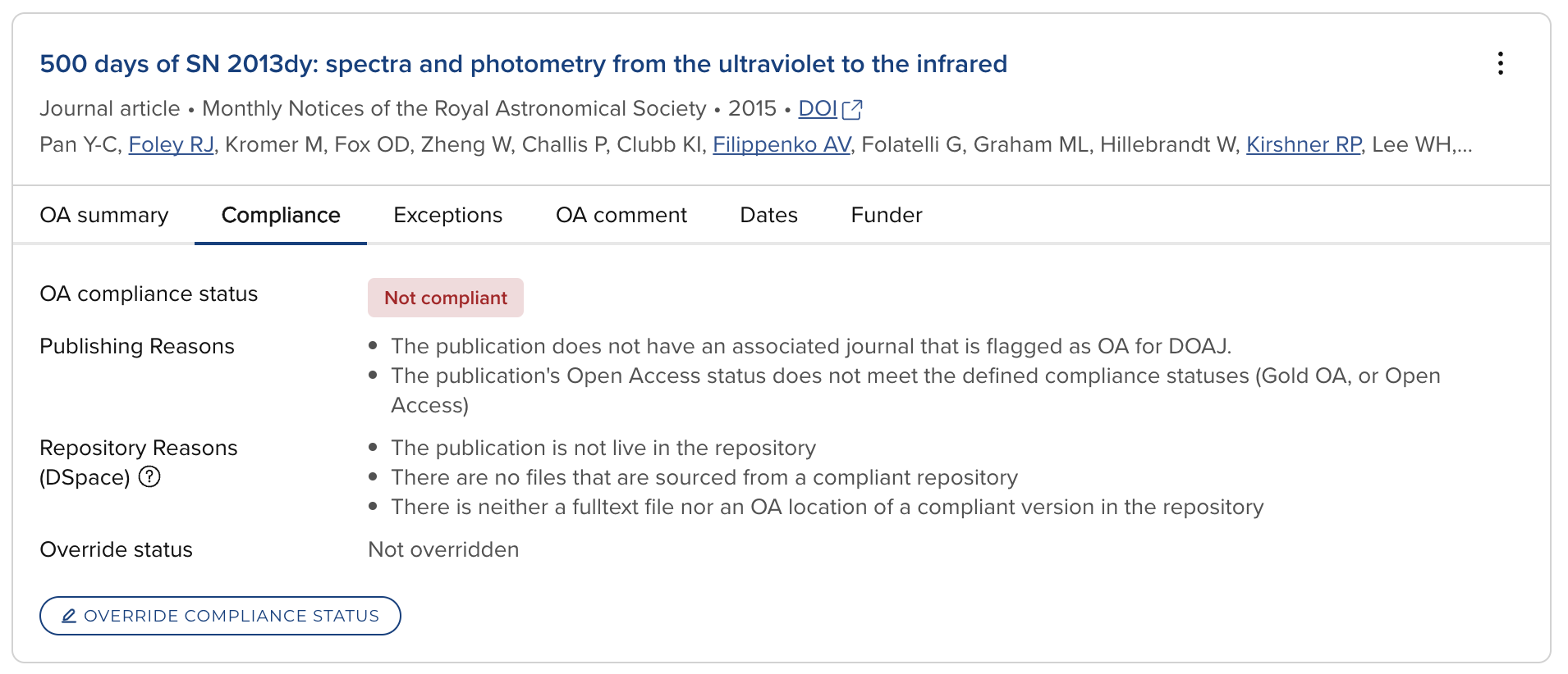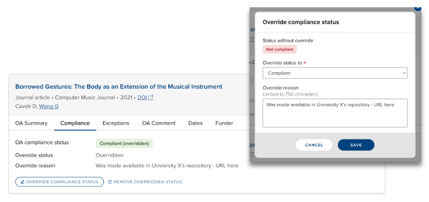 Where overrides of OA scheme compliance are enabled in the OA Monitor settings, the calculated compliance status of a publication can be overridden, along with the facility to capture notes relating to the override. Any applied override can be subsequently edited or removed.