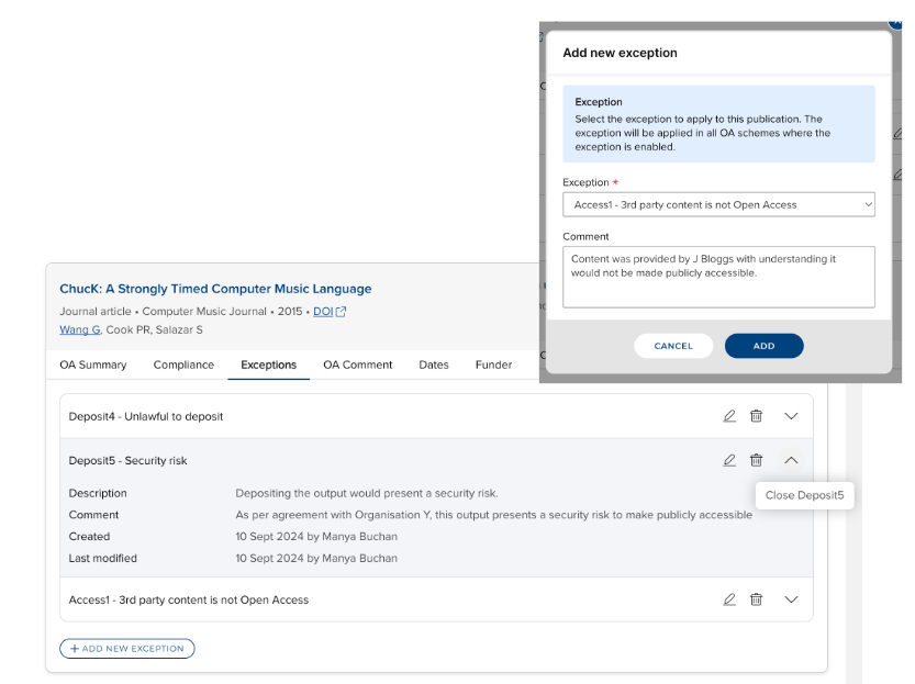 Where exceptions have been enabled for the OA scheme (via the scheme's configuration) , exceptions can be applied to a publication, along with the facility to capture notes relating to each exception applied. Multiple exceptions can be applied to a single publication. Any applied exception can be subsequently edited or removed.