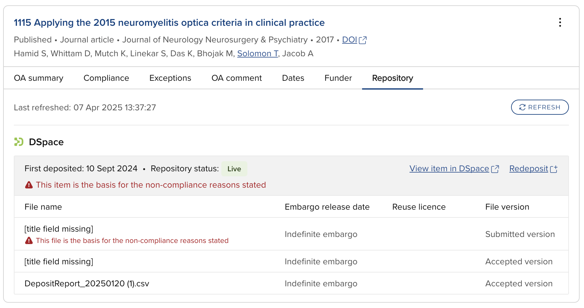 The Repository tab gives OA Monitor users direct visibility of deposited files, repository status, version, embargo release date, and repository location; along with the function to deposit, re-deposit, and view the item directly in the repository. The tab also gives an indication of which repository item and/or file formed the basis of the compliant / not-compliant status.