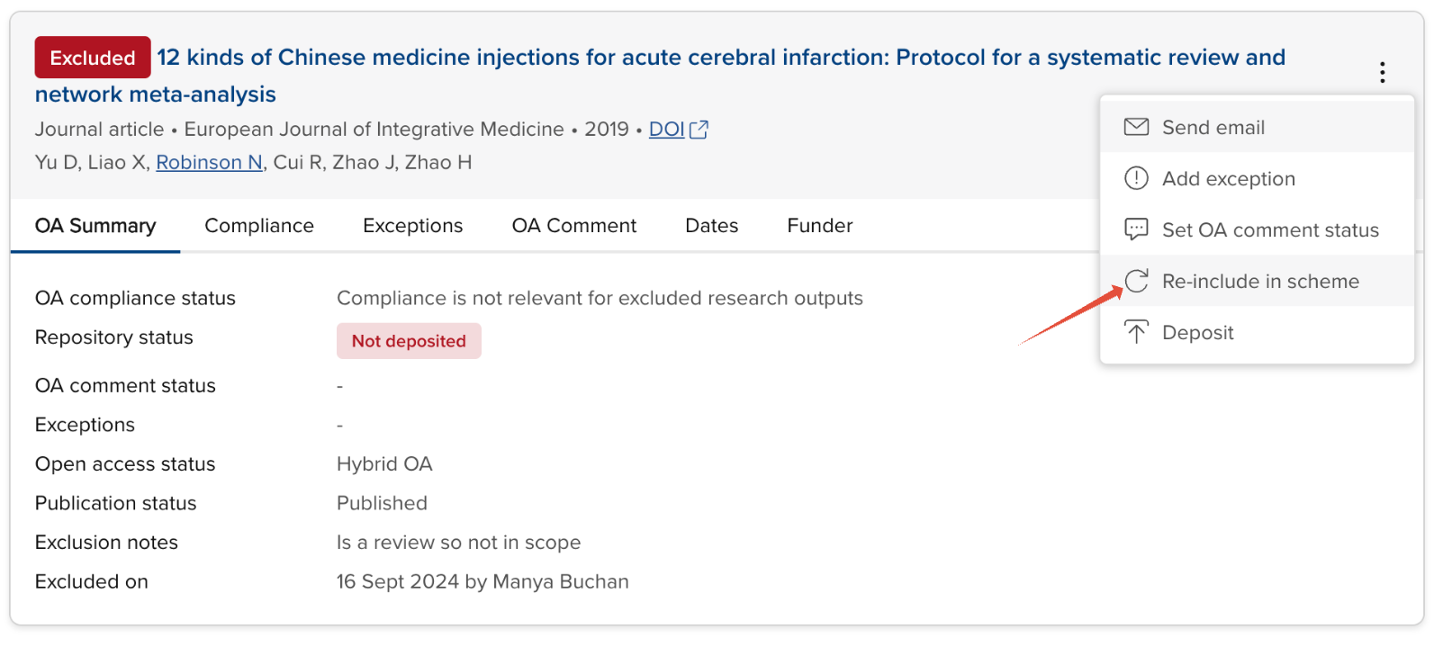 Image: Re-include action on an excluded publication
