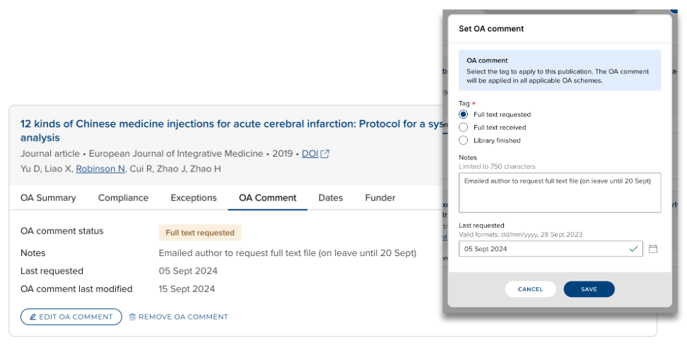 Where the OA commenting tool is enabled in the OA Monitor settings, OA comments and a tag can be added to a publication. The OA comment or tag can be subsequently edited or removed.