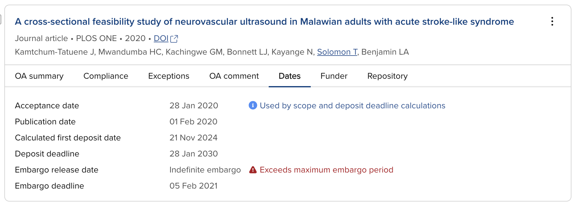 Display the data from the repository record (and file, where relevant) that determined that the publication is compliant