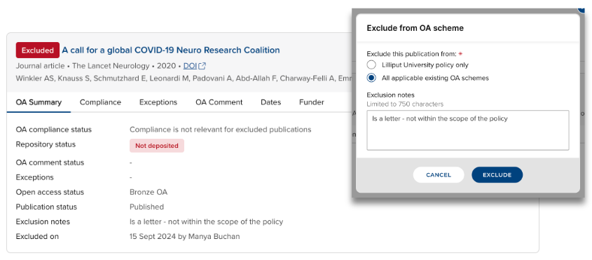Where exclusions are enabled in the OA Monitor settings, a publication can be excluded from the OA scheme (or all existing OA schemes), along with the facility to capture notes relating to the exclusion. Excluding a publication will remove it from the scope of the scheme and compliance will not be calculated.