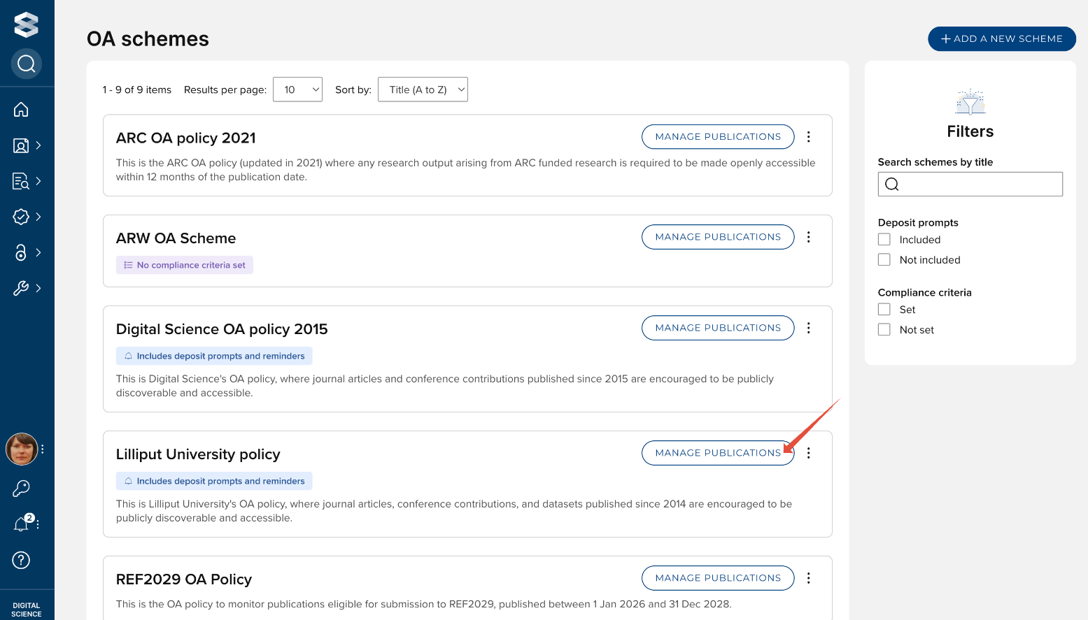 OA schemes can be accessed by authorised users via Open Access > [MANAGE OPEN ACCESS] > OA schemes. Find the OA scheme you wish to manage, and select 'Manage publications'.